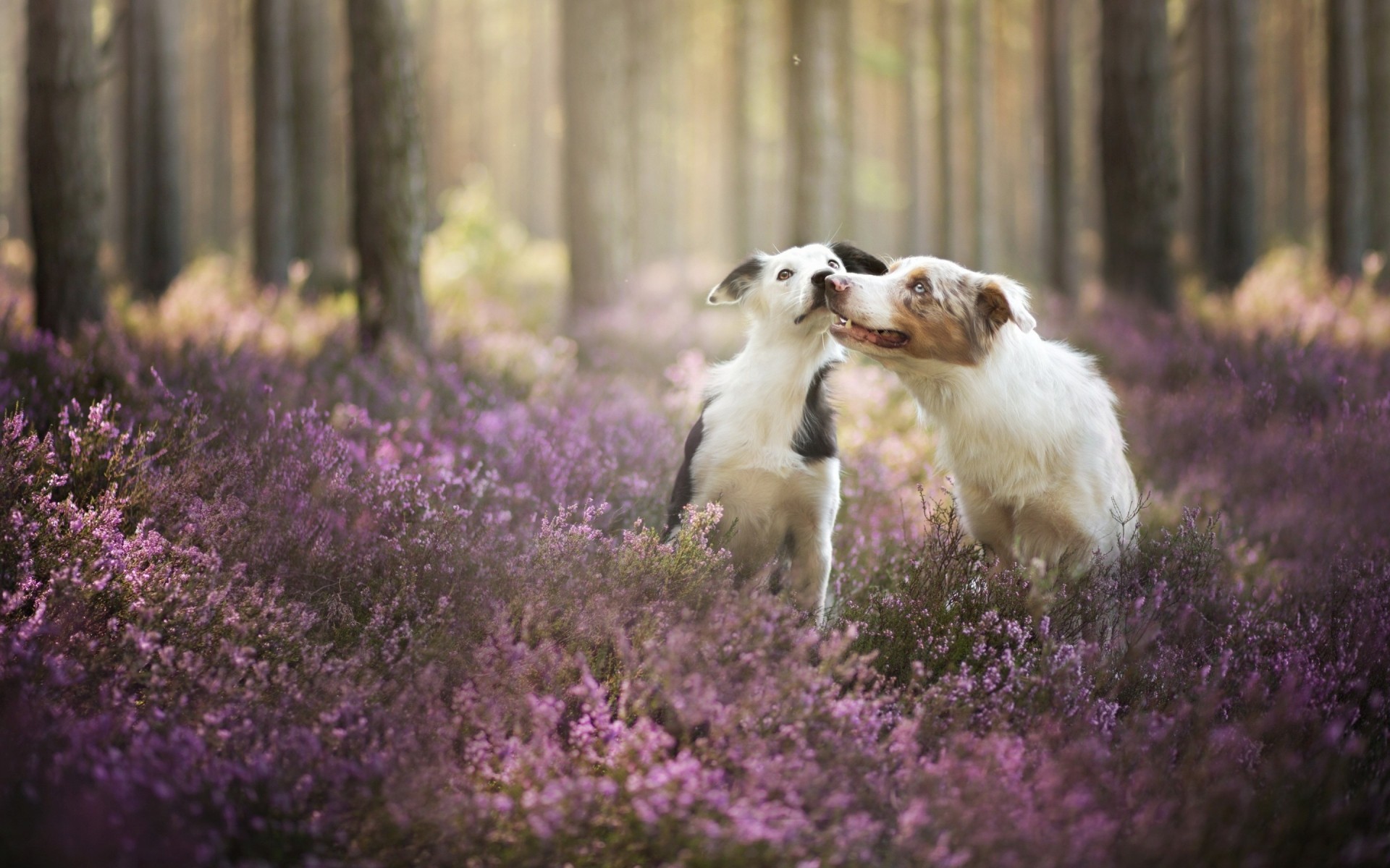 Une paire de toutous s'ébattant au milieu de l'herbe en fleursUne paire de toutous s'ébattant au milieu de l'herbe en fleurs