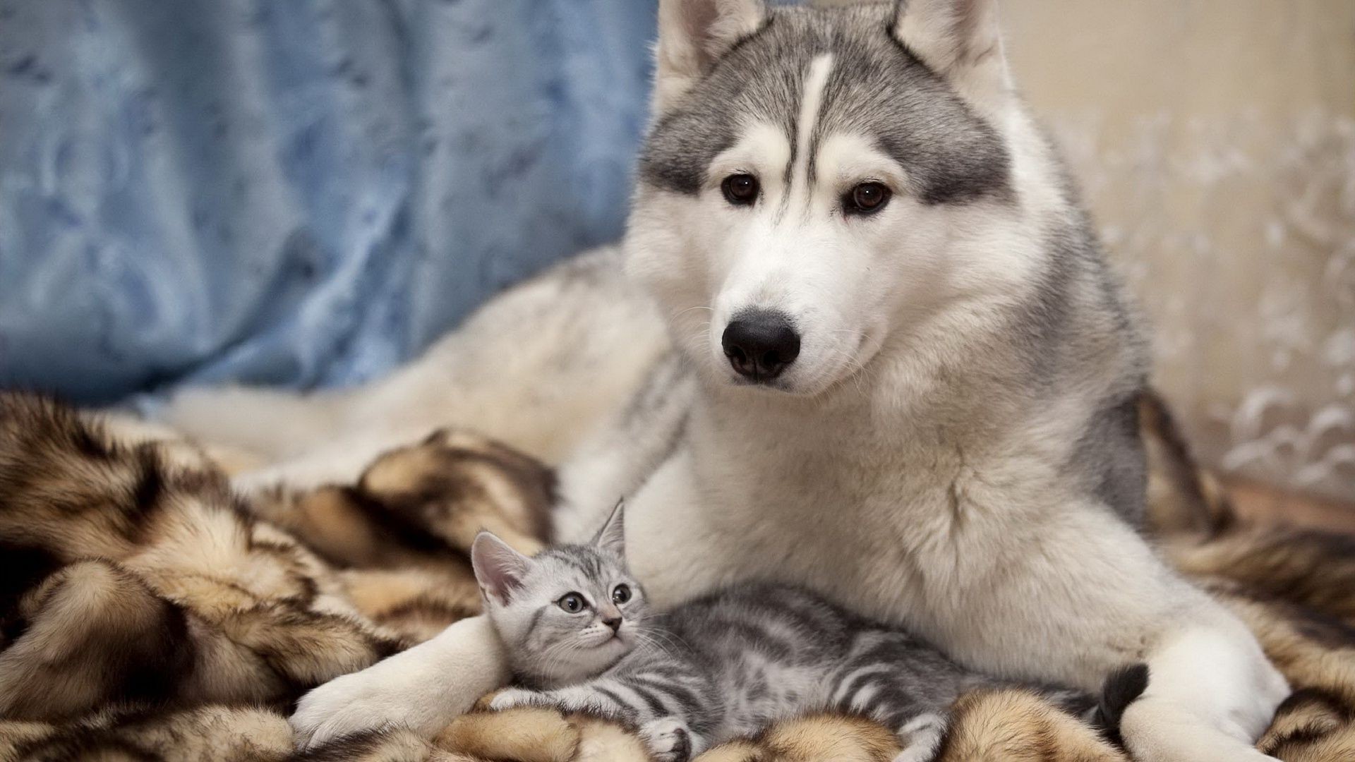 Photo d'un chien Husky avec un chat sur un plaid
