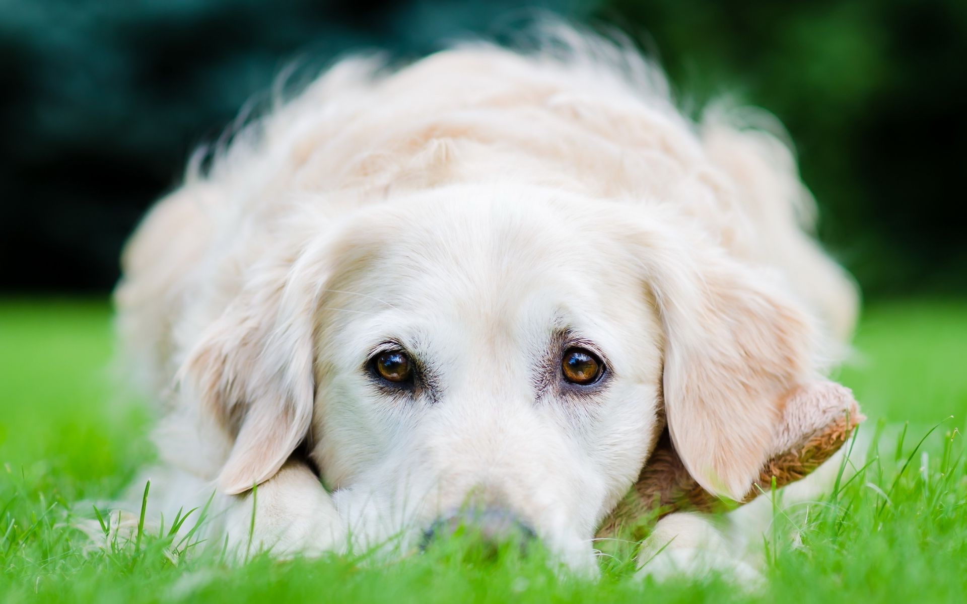 Chien blanc se trouve sur la pelouse verte