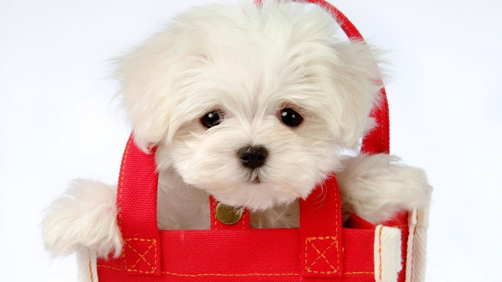 Chiot blanc dans un sac rouge