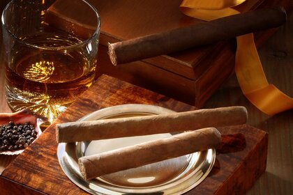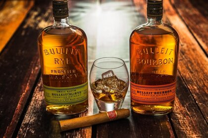 Deux bouteilles en verre avec du whisky et un stankan avec une cigaretteDeux bouteilles en verre avec du whisky et un stankan avec une cigarette