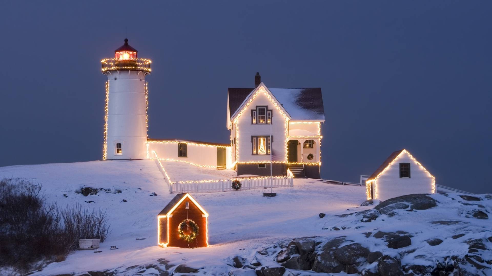 Maison chaude lumineuse sur une colline enneigée