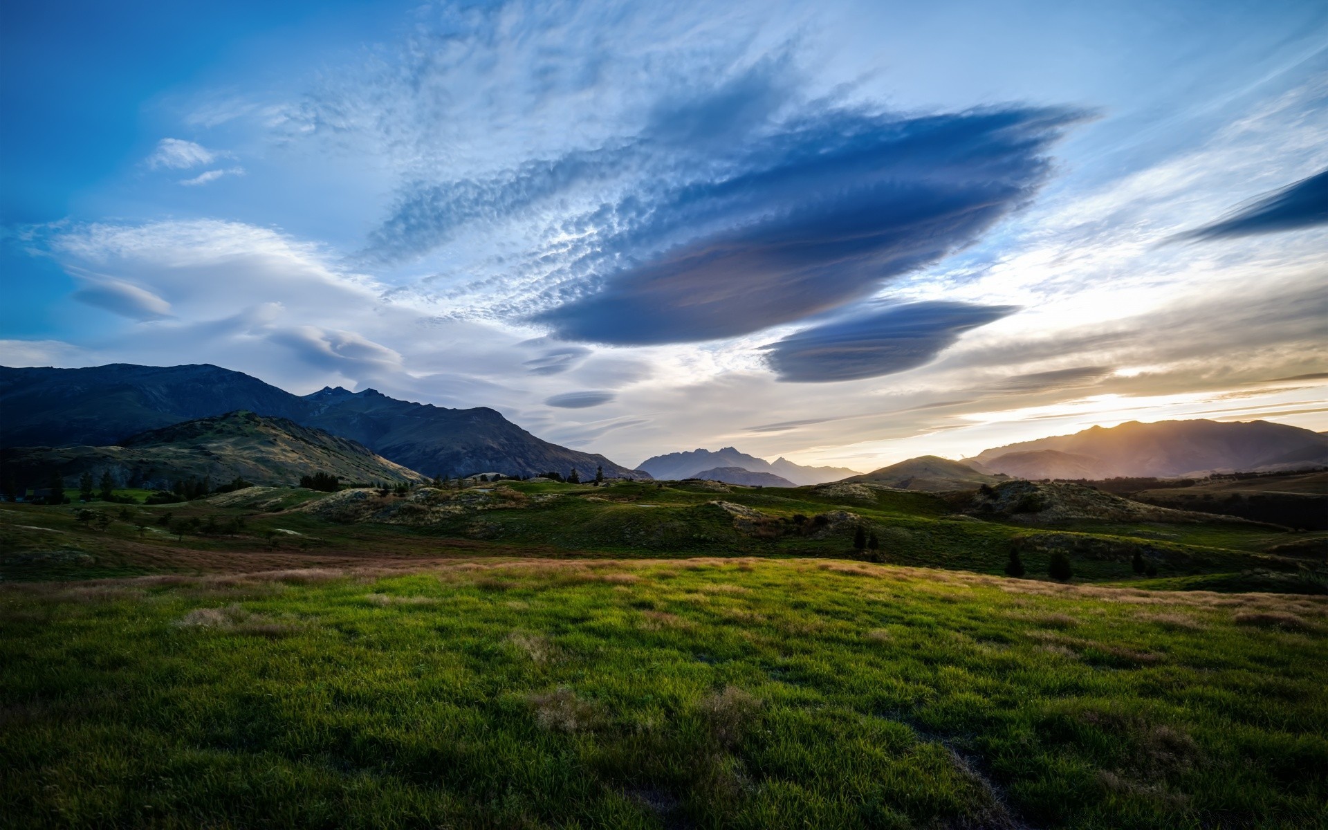 Paysage avec des nuages sombres et un champ verdoyantPaysage avec des nuages sombres et un champ verdoyant