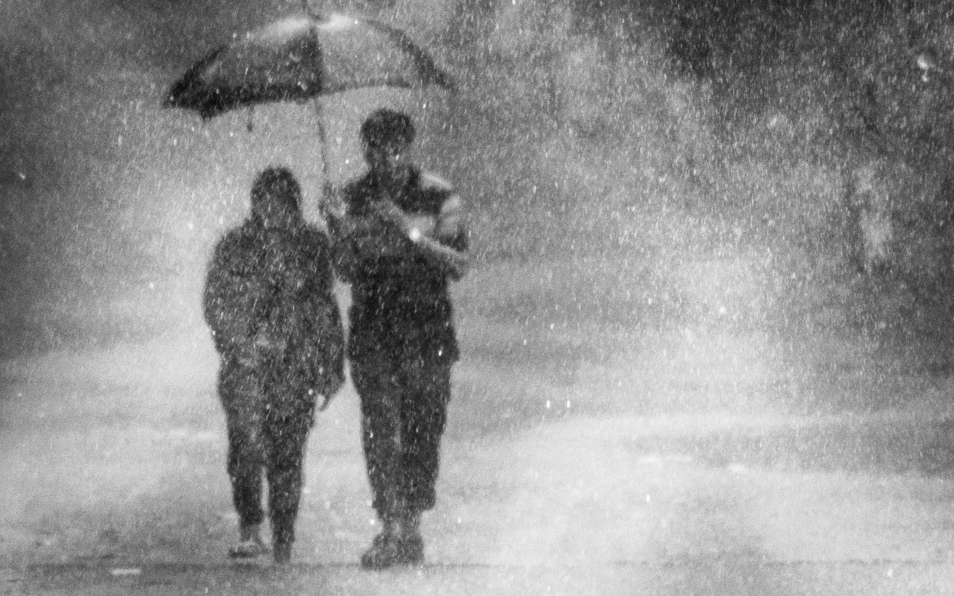 Homme adulte porte un parapluie dans les éclaboussures de voiture
