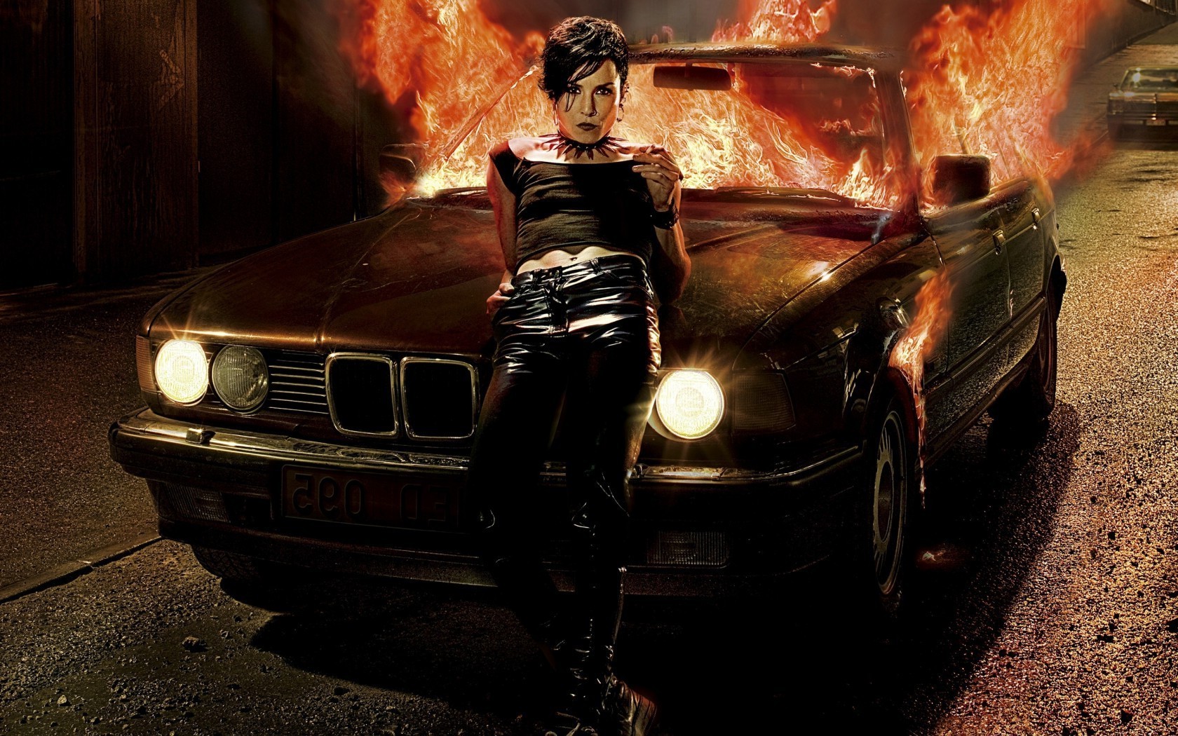 Flamme d'une voiture qui roule sur un fond de ciel rouge sang