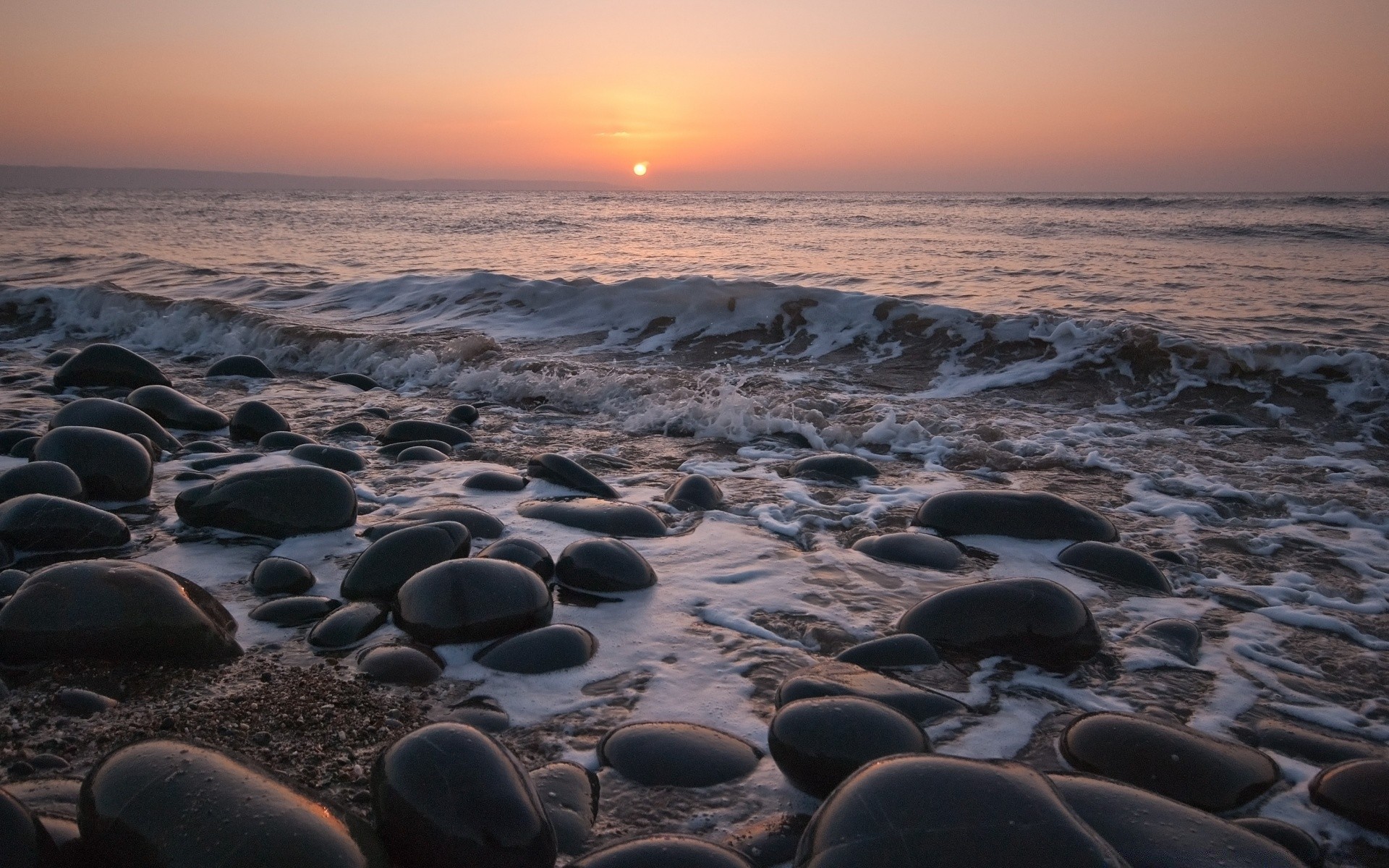 Coucher de soleil dans l'océan et de grosses pierres sur le rivage