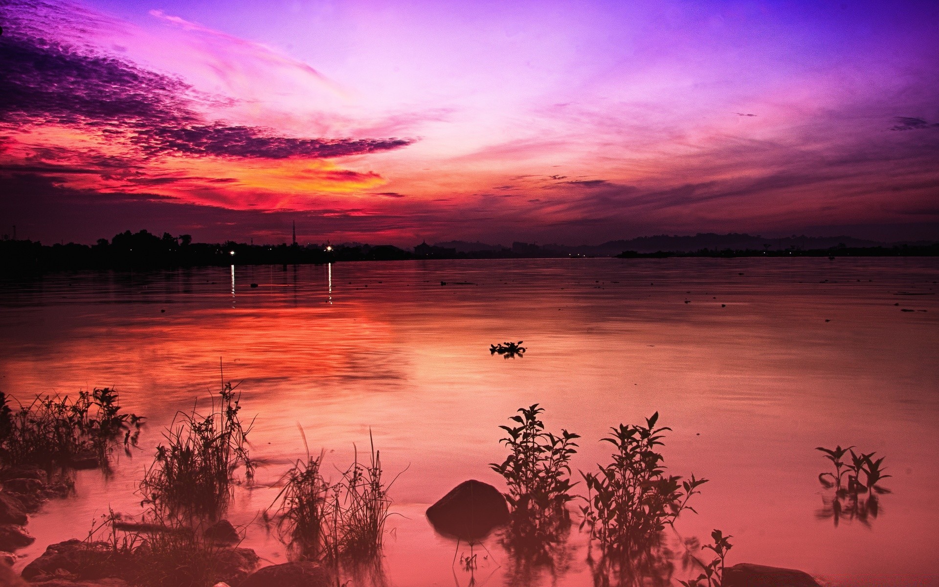 Coucher de soleil sur la rivière large. Dans le ciel des Cirrus multicolores