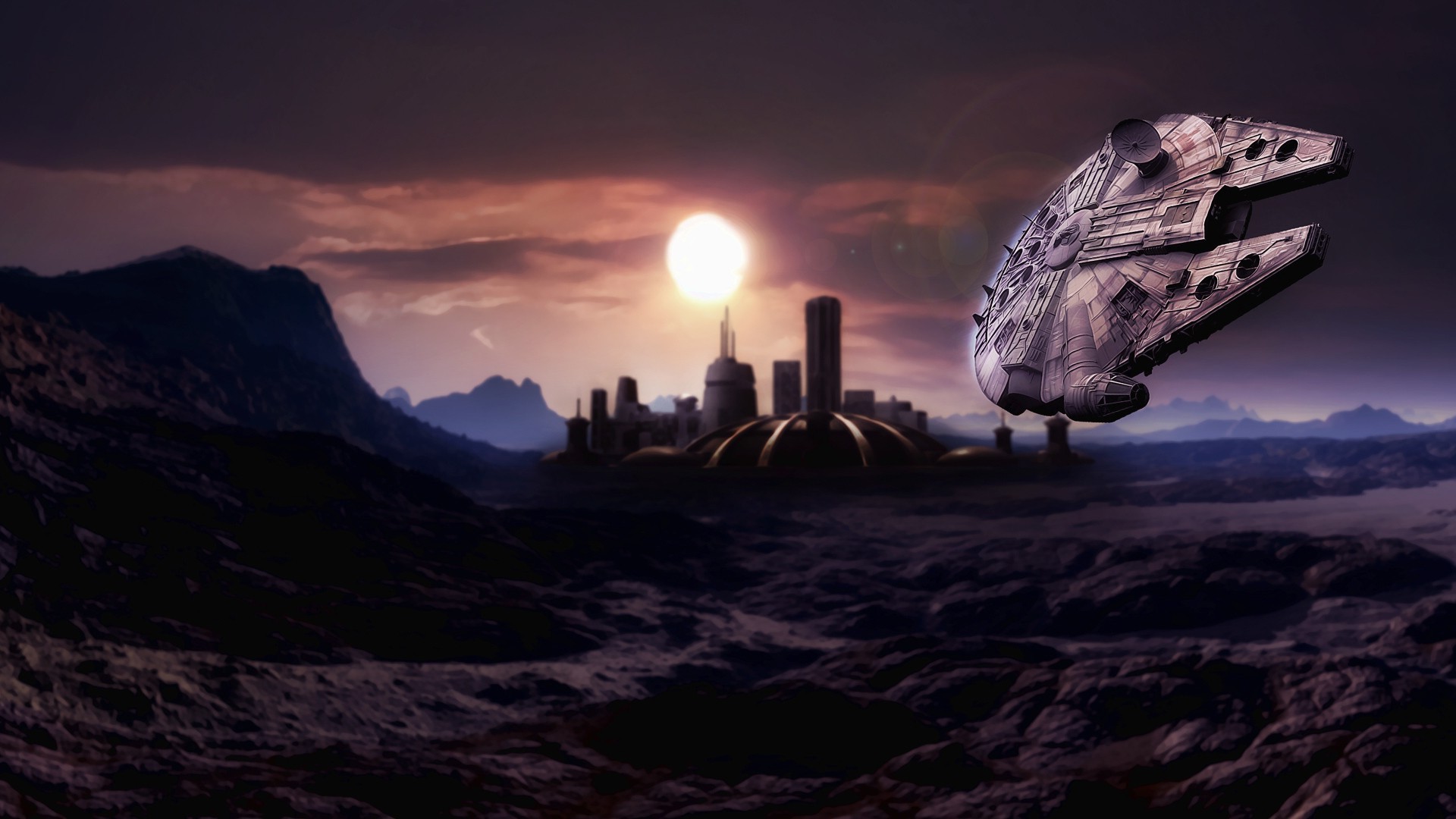 Vaisseaux spatiaux sur fond de coucher de soleil et de montagnes