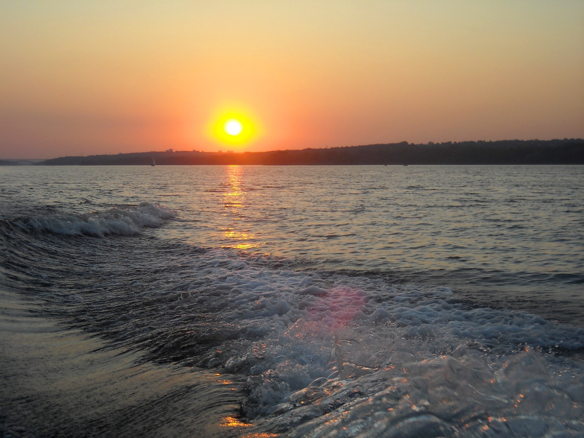 Coucher de soleil sur l'eau avec un bateau à moteur