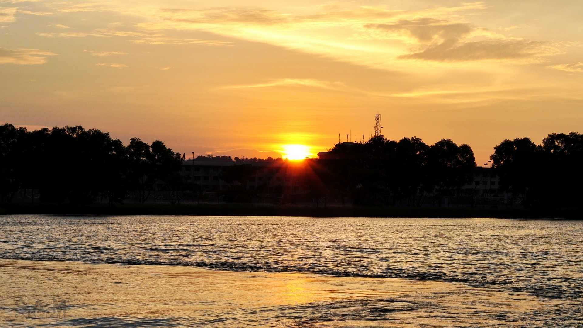 Coucher de soleil sombre au bord de l'eau avec des pierres