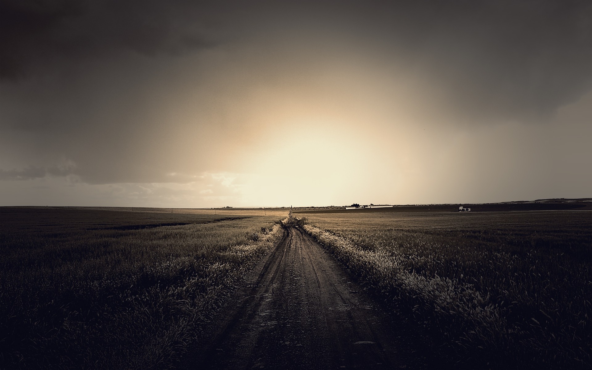 Coucher de soleil sur le fond d'une route brumeuse au loin