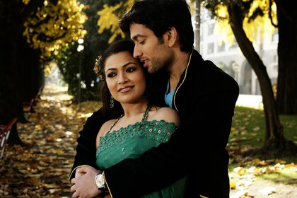 Couple amoureux s'embrasser au milieu d'un large champ d'or