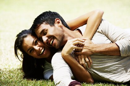 Couple d'amoureux sur le lit sur fond de coucher de soleilCouple d'amoureux sur le lit sur fond de coucher de soleil