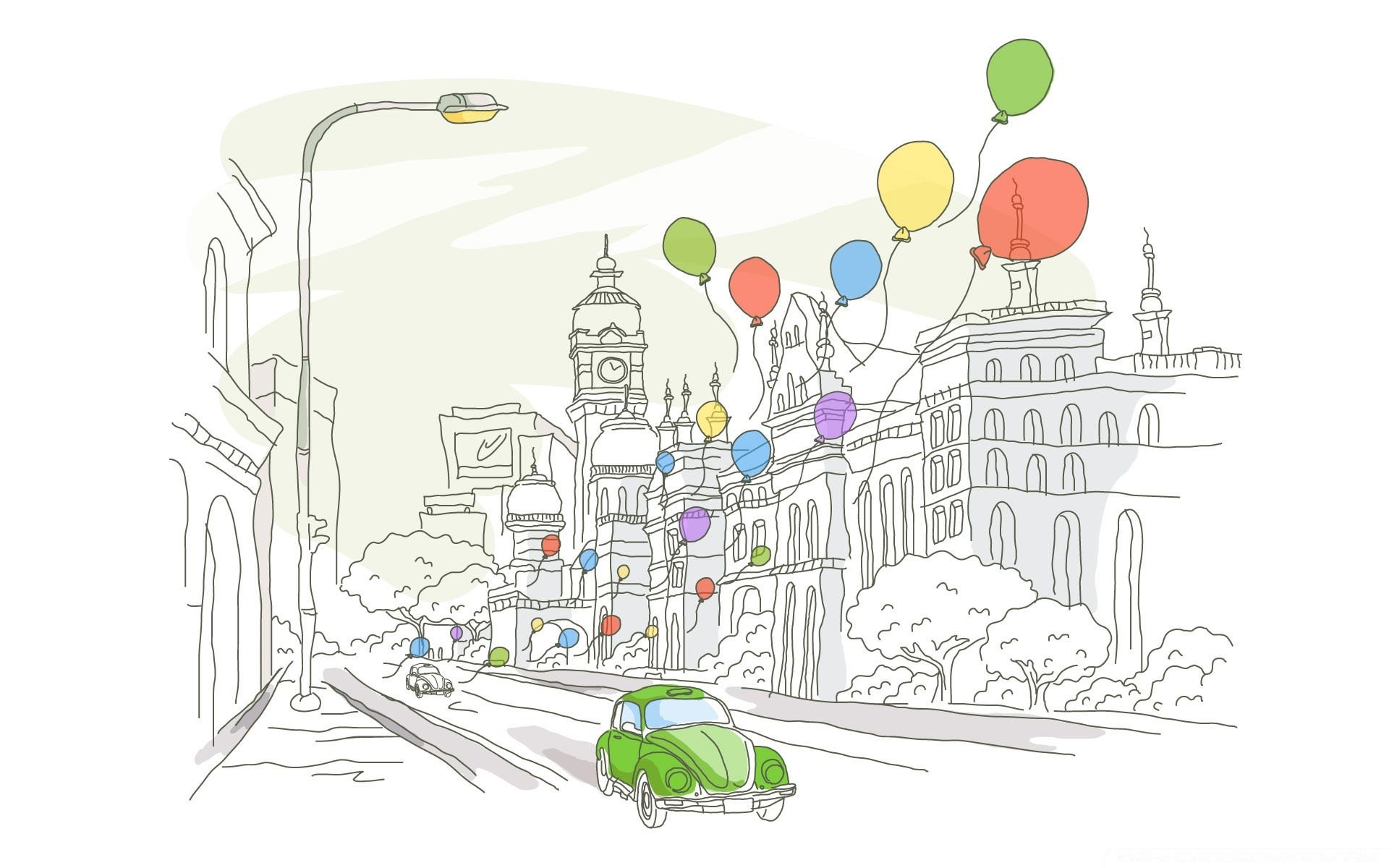 Dessin d'une voiture verte et des ballons dans la rue de la ville