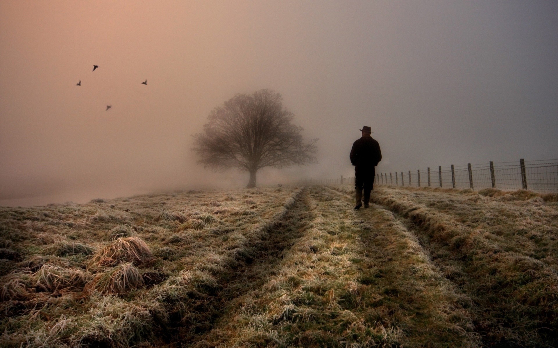 Homme marchant sur le champ dans le brouillard