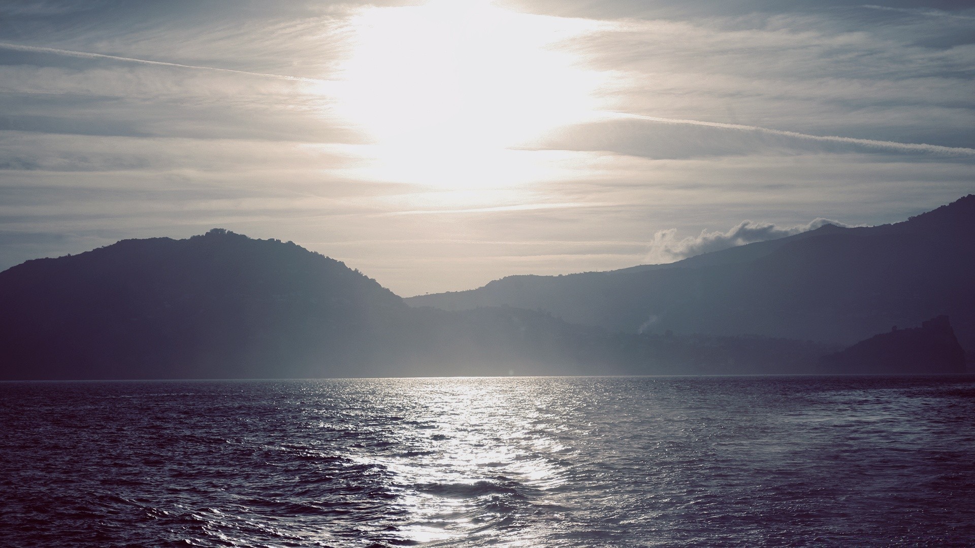 Reflet du soleil dans le lac sur fond de montagnesReflet du soleil dans le lac sur fond de montagnes