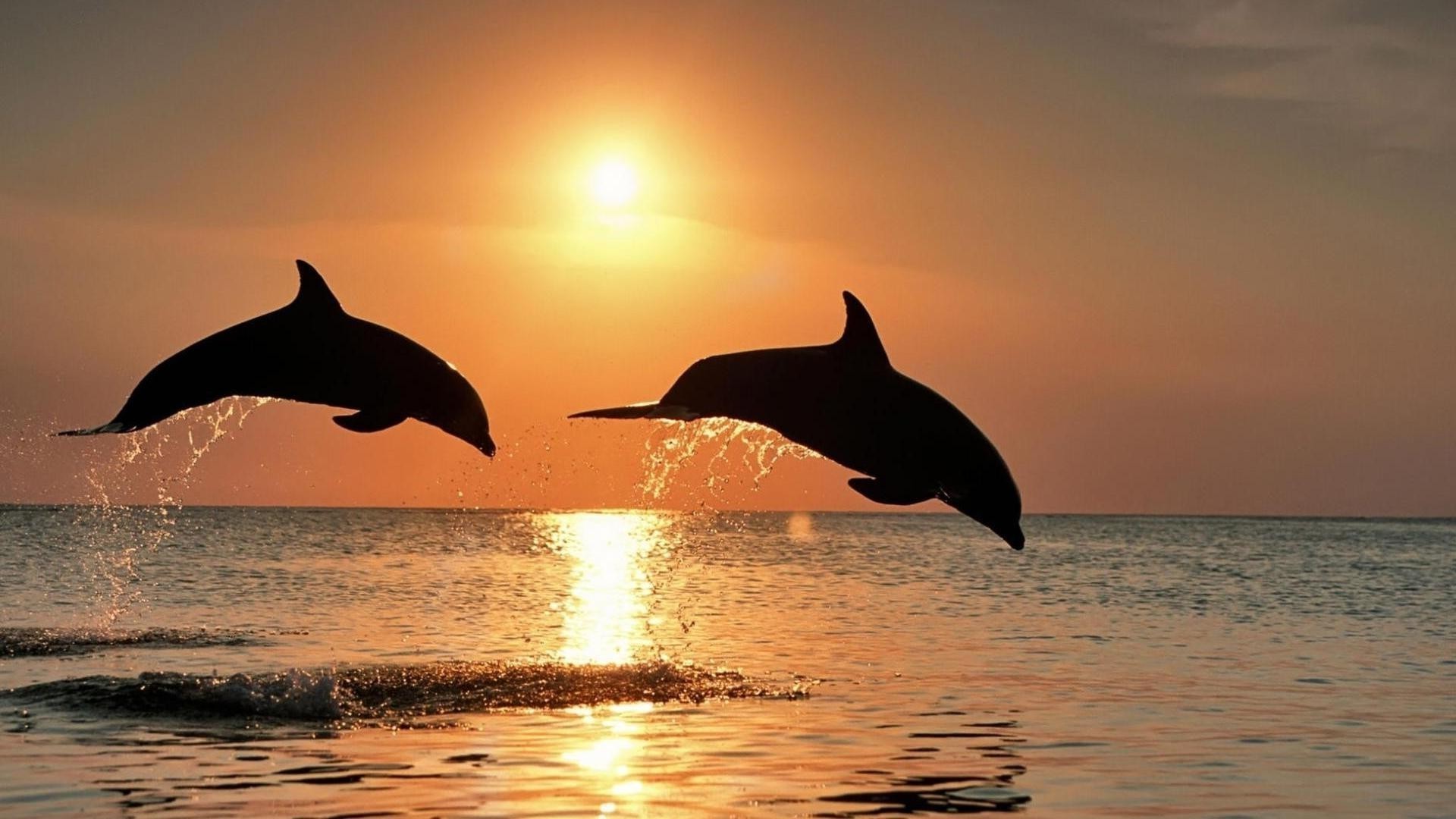 DAUPHINS SUR FOND DE MER ET LE SOLEIL