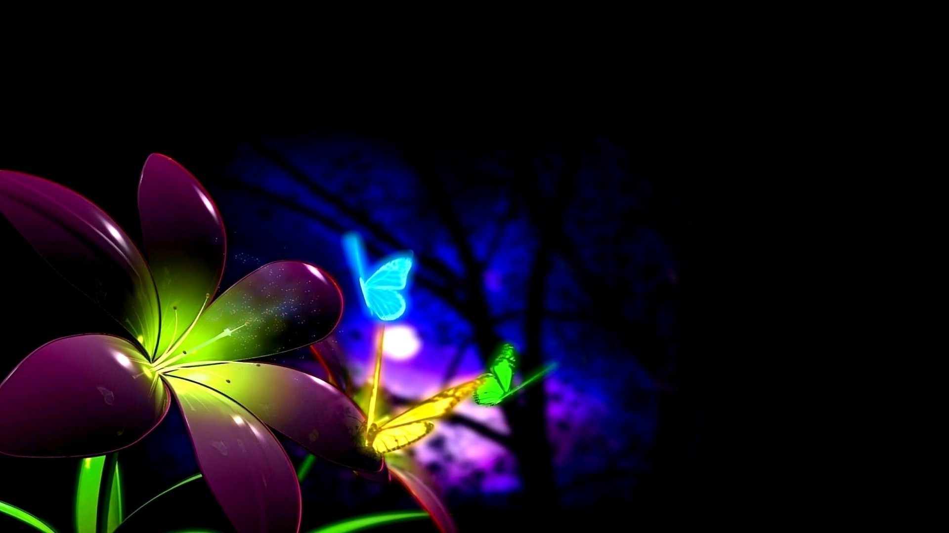 Fleurs lumineuses avec des papillons volants