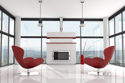Appartement design moderne. cheminée avec chaises rougesAppartement design moderne. Cheminée avec chaises rouges