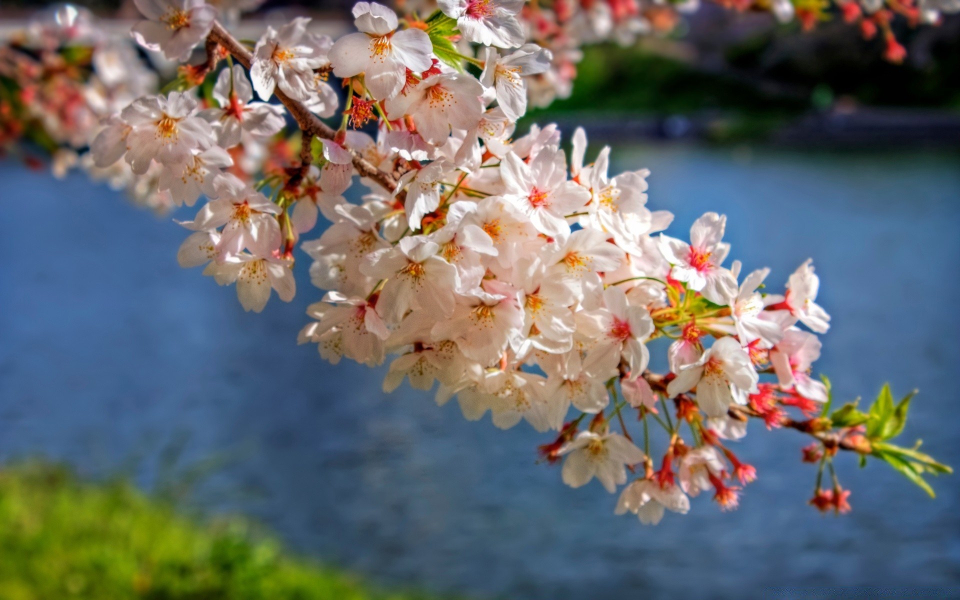 Branche avec des fleurs blanches suspendus au-dessus de l'eau