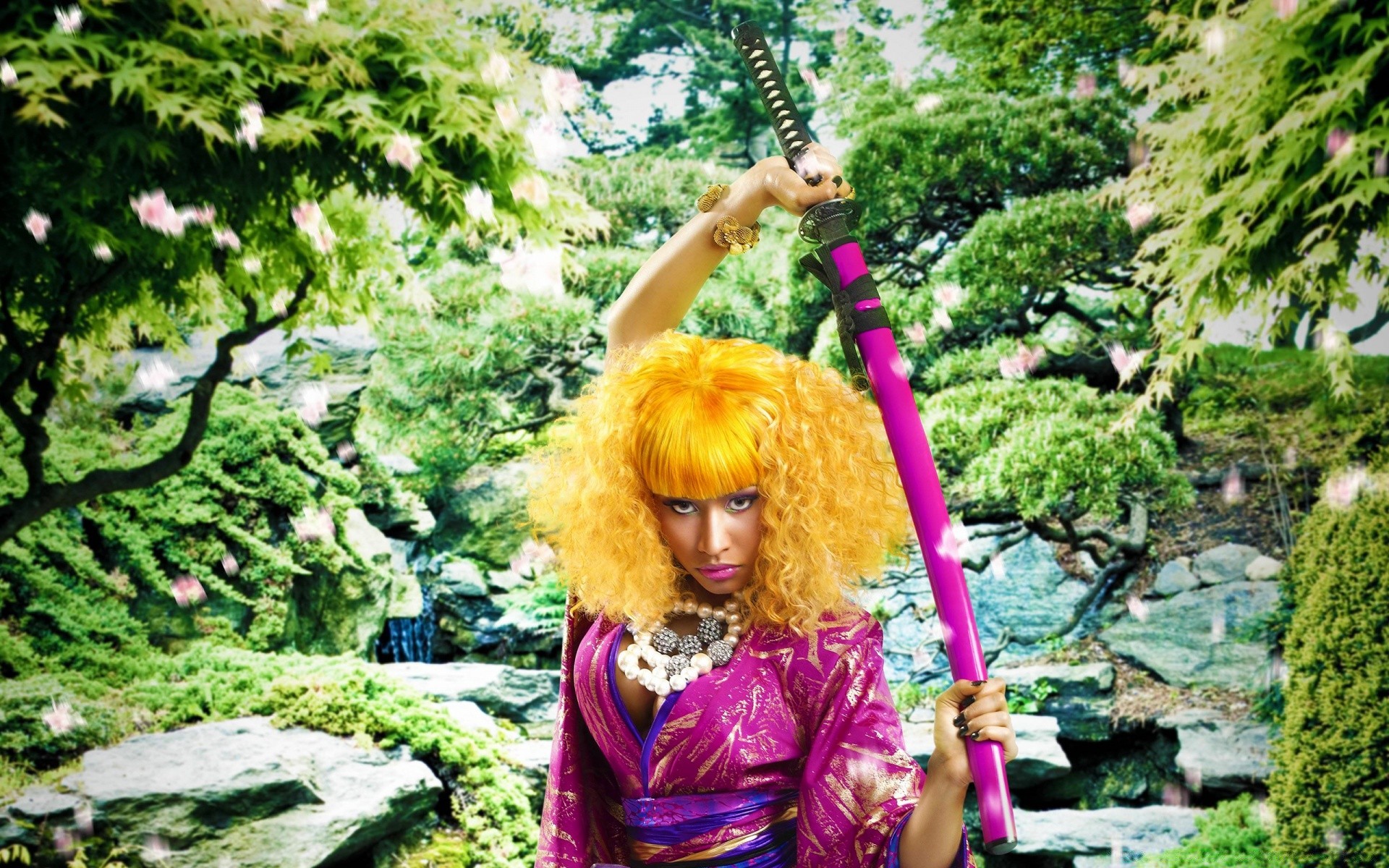 Femme en perruque brillante et des vêtements japonais