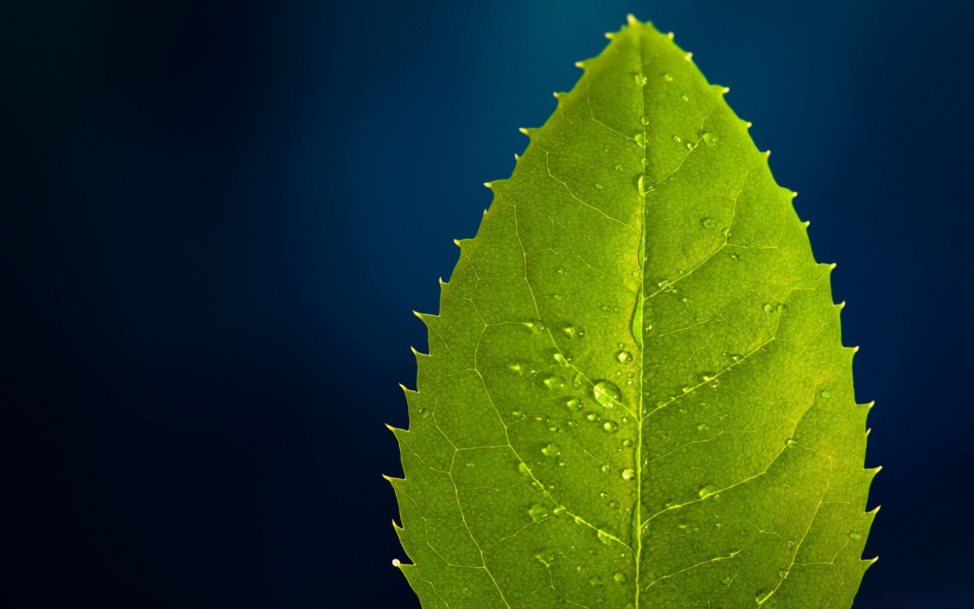Gros plan de la feuille avec des gouttes sur fond bleuGros plan de la feuille avec des gouttes sur fond bleu