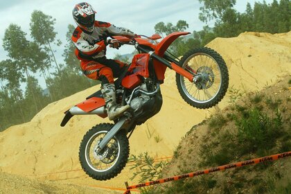 Coureur en costume rouge et sur une moto rouge