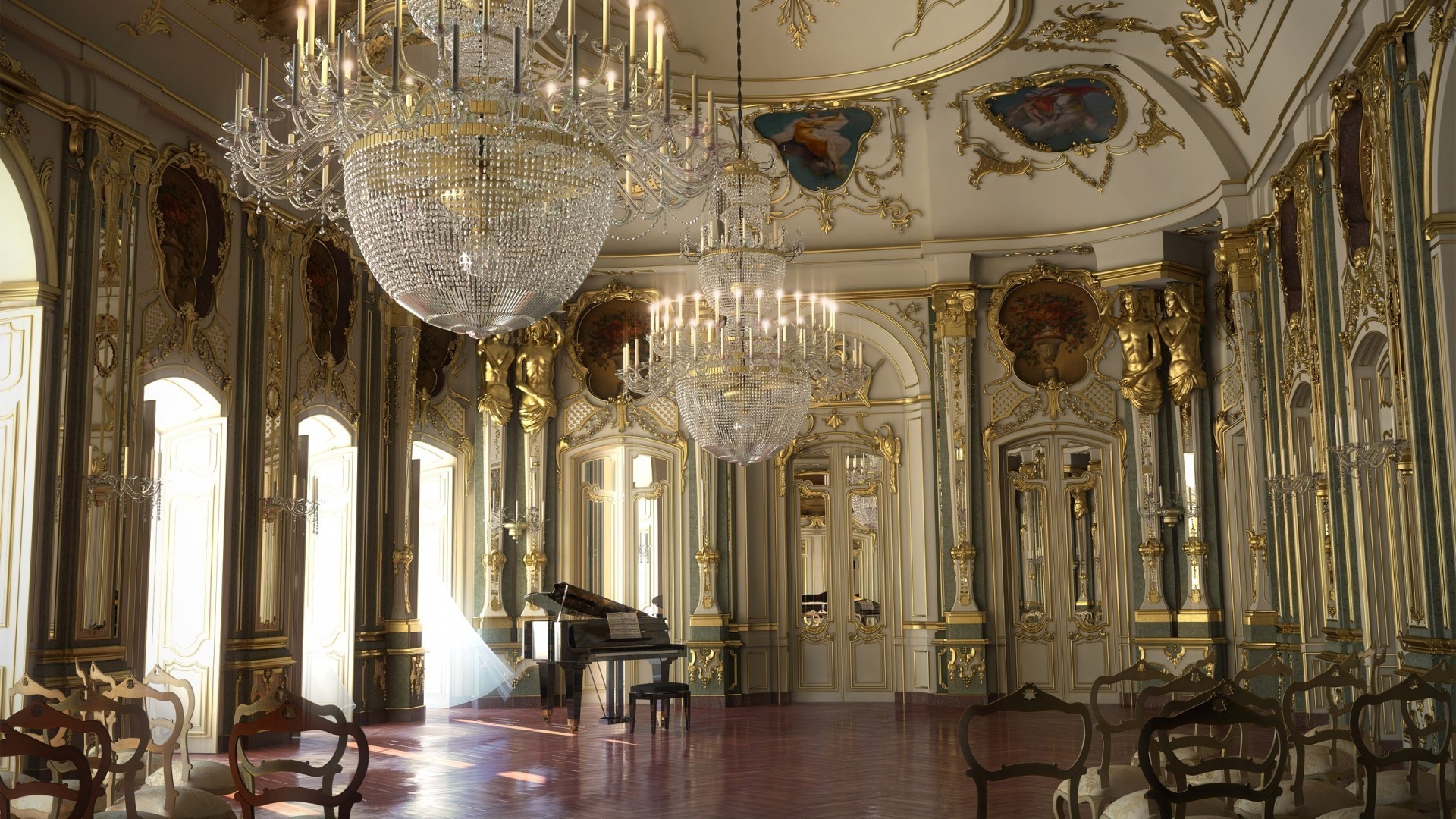 Salle de concert du palais avec bas-reliefs, fresques, dorures et grands lustres en cristal