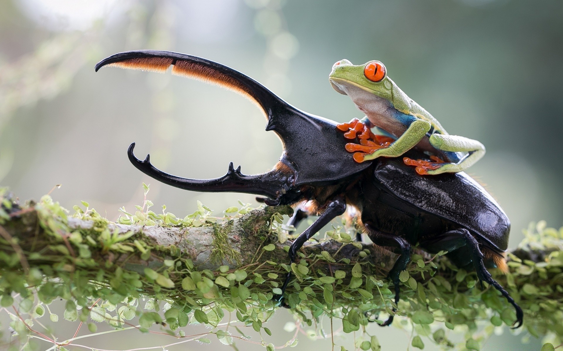 La grenouille Monte sur un Coléoptère rhinocéros noir