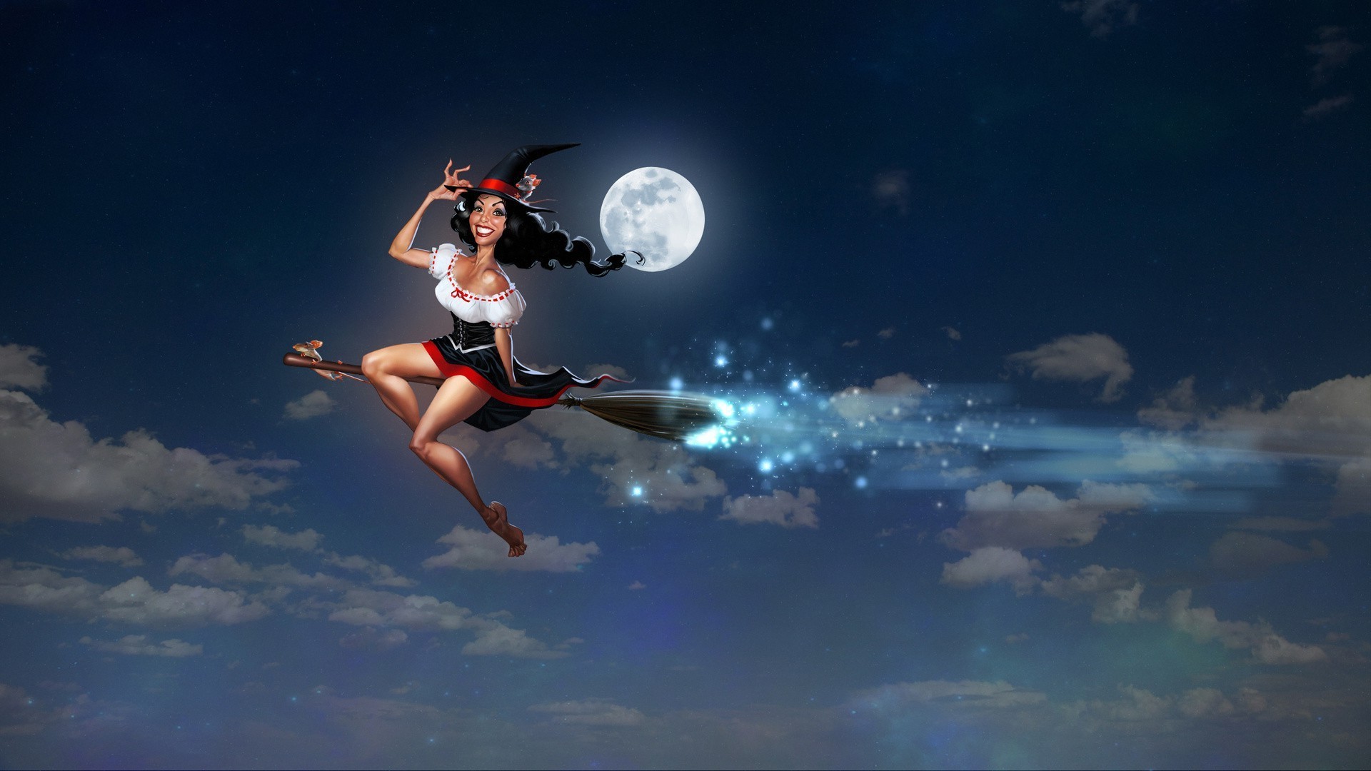 Sorcière joyeuse vole sur un balai la nuit à la pleine lune