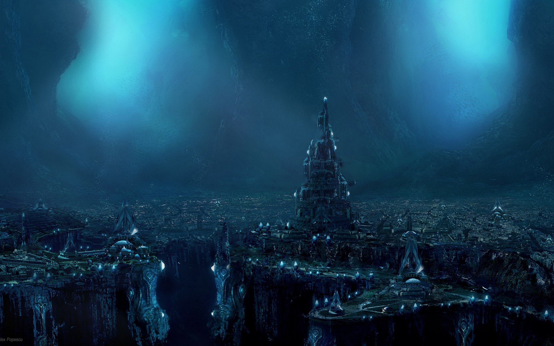 Ville dans le brouillard fantastique au coucher du soleilVille dans le brouillard fantastique au coucher du soleil
