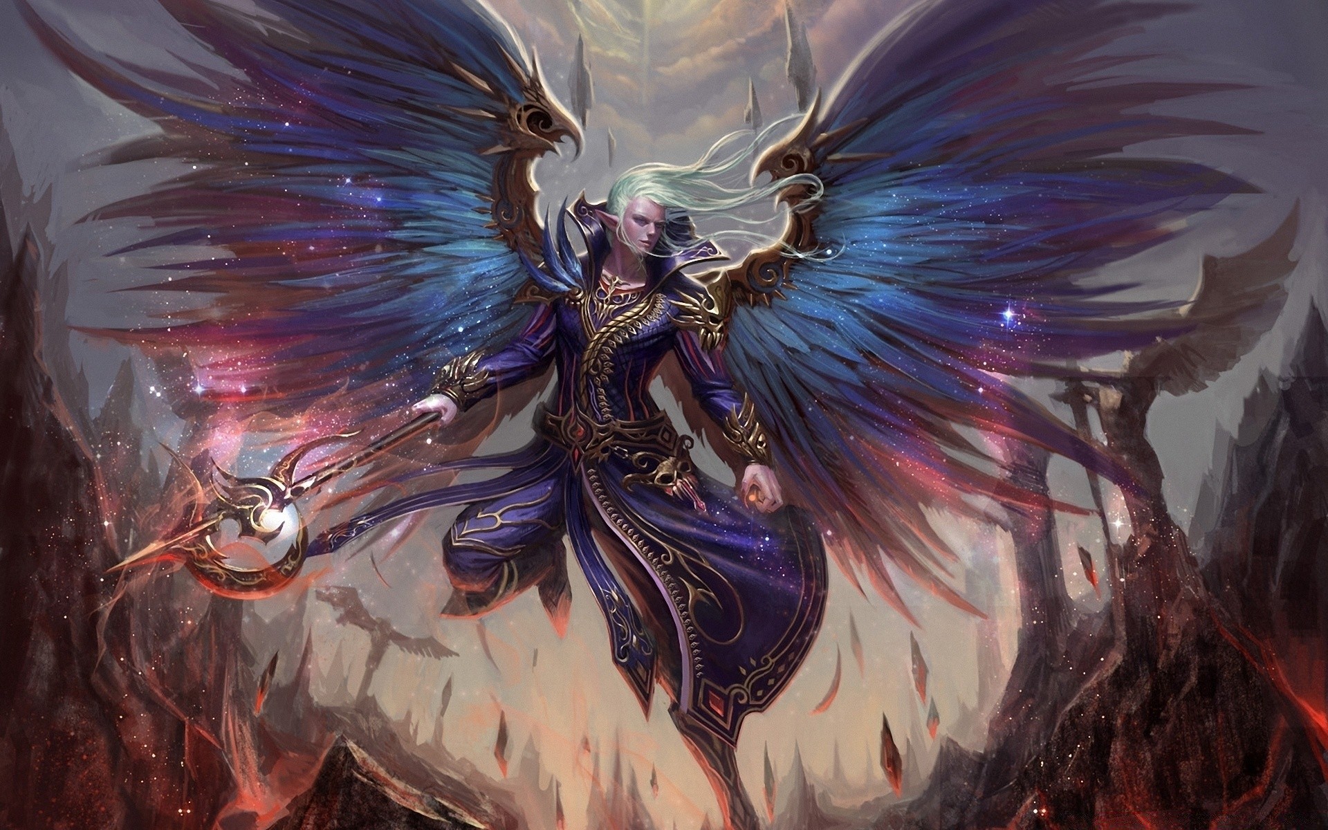 Beau dessin fantastique d'un homme ailé avec un bâton