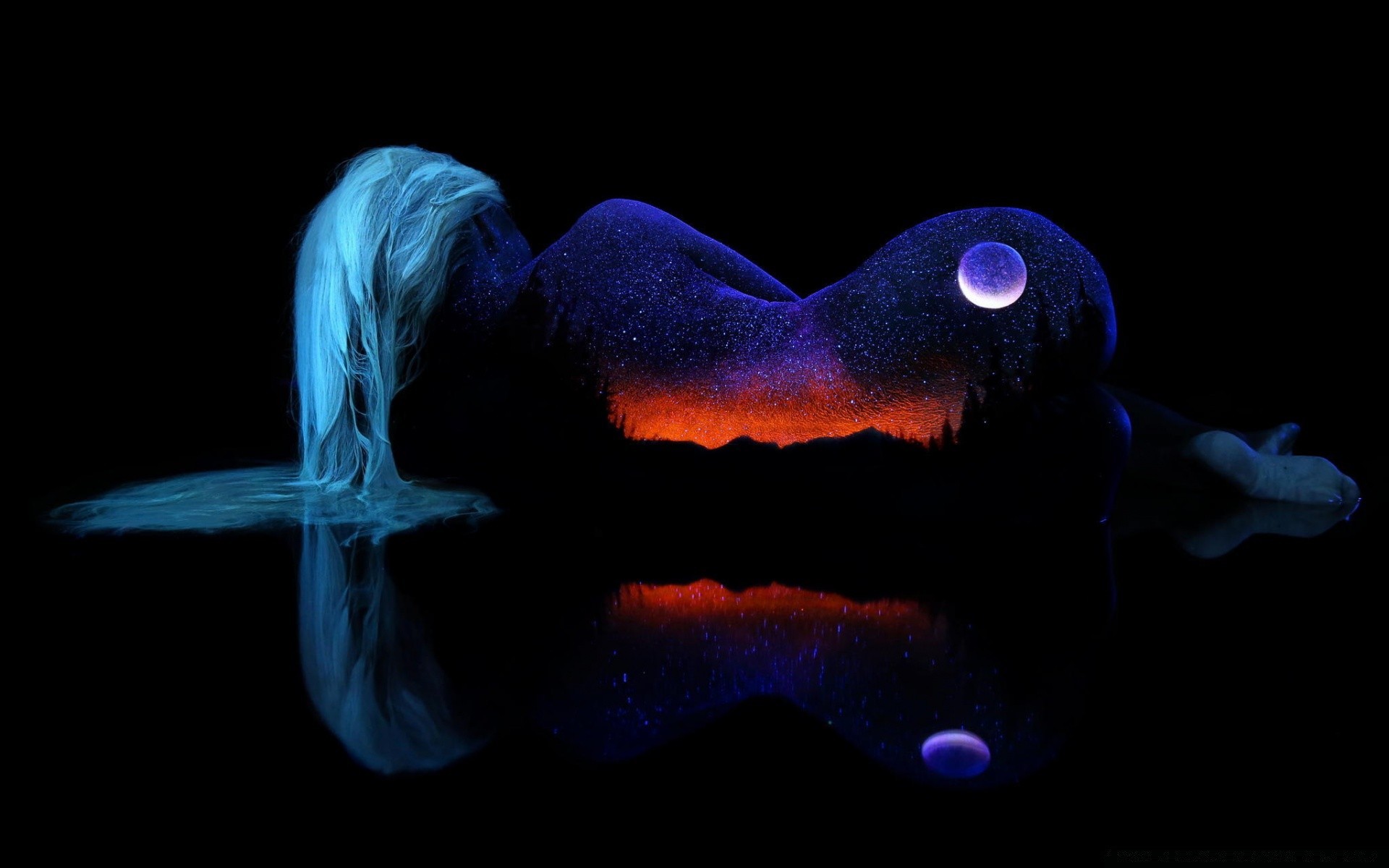 Fille graphique 3D avec sur fond bleu avec une coiffure de givre et des armes à froid dans les mains