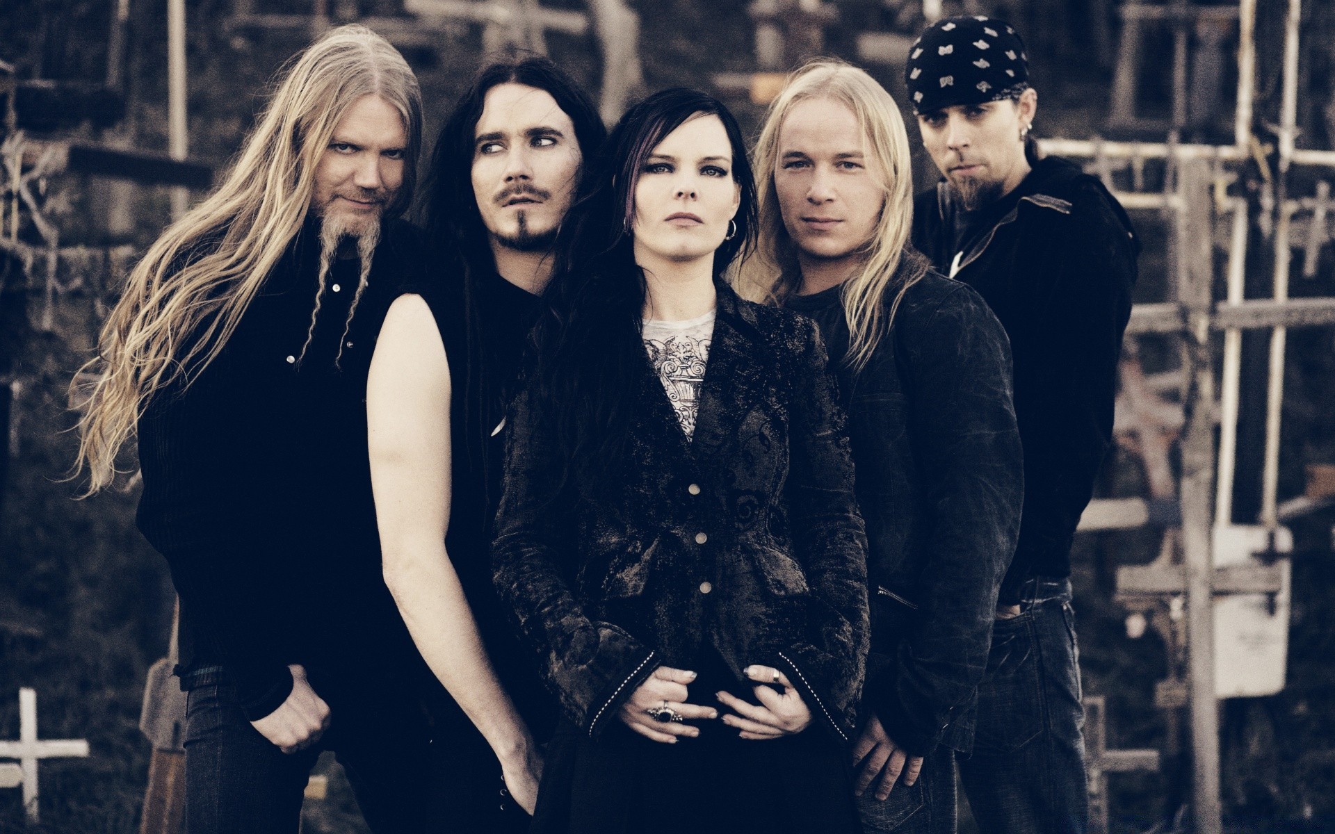 Cinq devant une femme tout en vêtements étranges