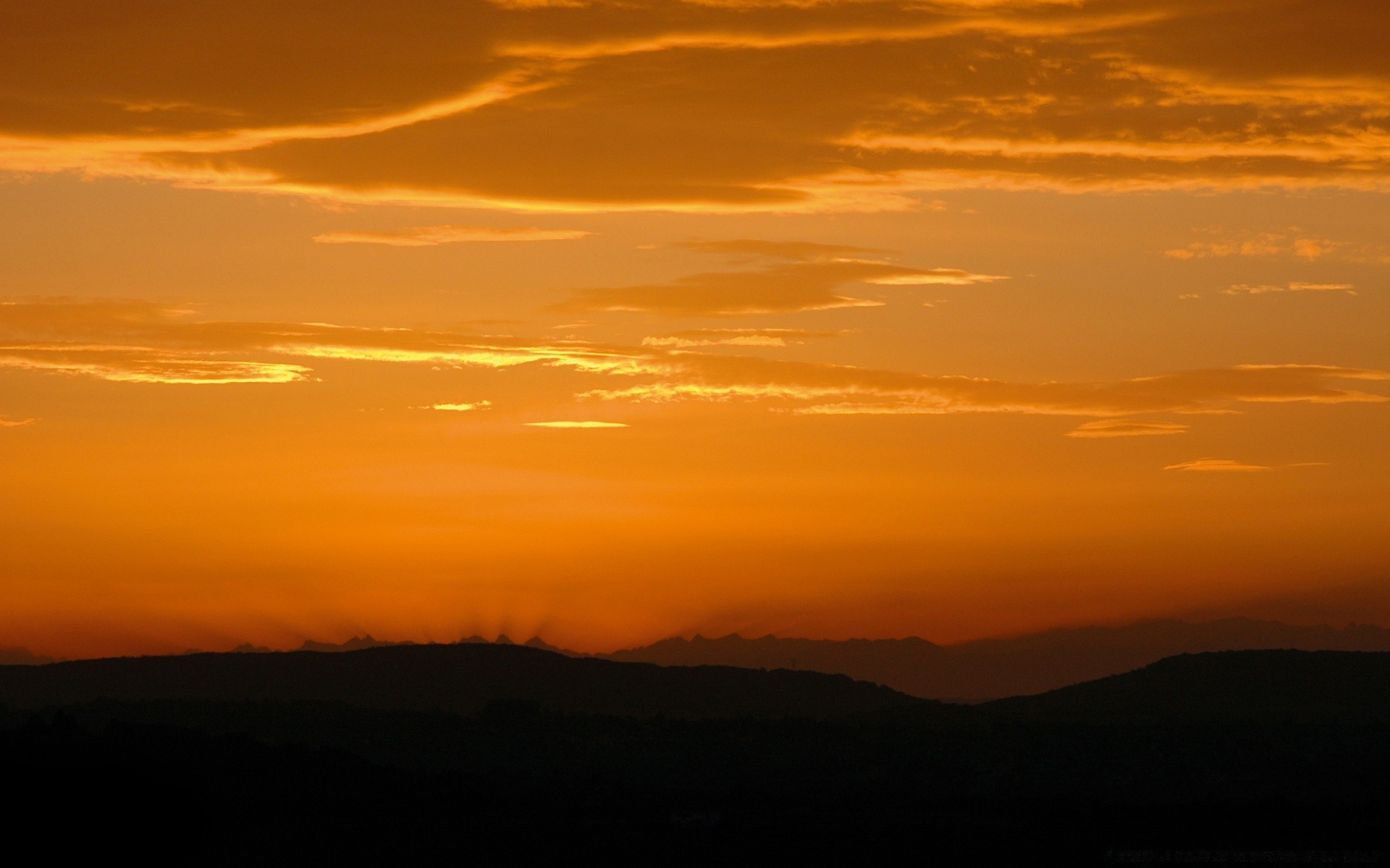 Paysage de montagnes, océan, pierres et coucher de soleil de feu
