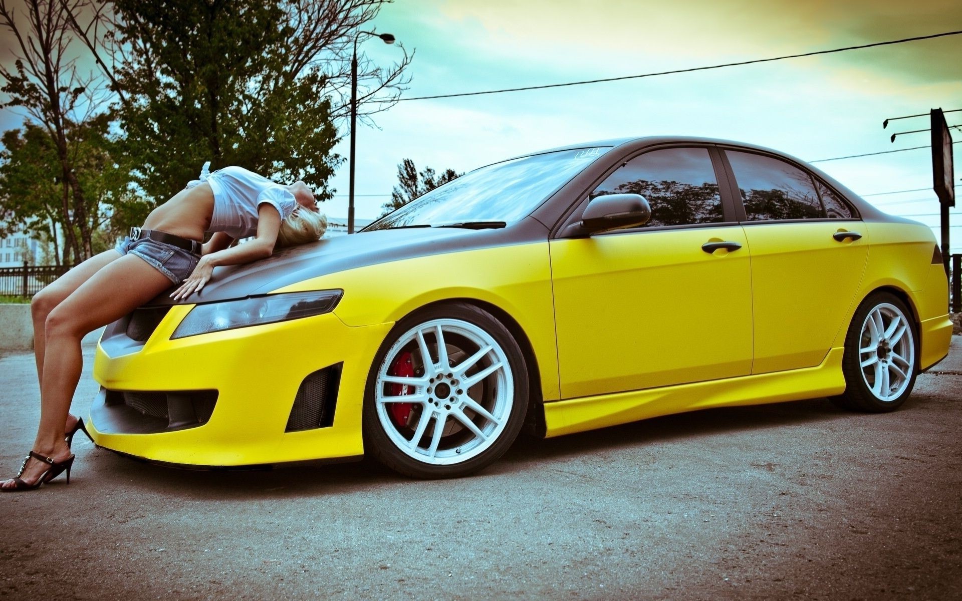 Fille sur le capot d'une voiture jaune