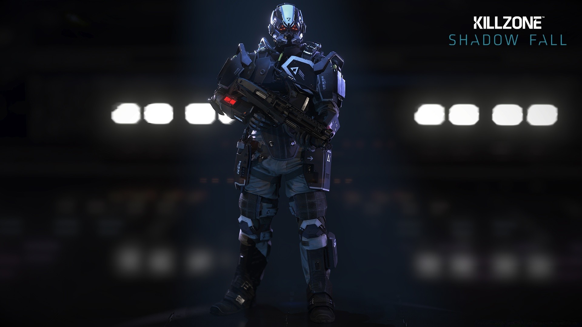 Robot cyborg sur fond sombre avec des lampes alluméesRobot cyborg sur fond sombre avec des lampes allumées