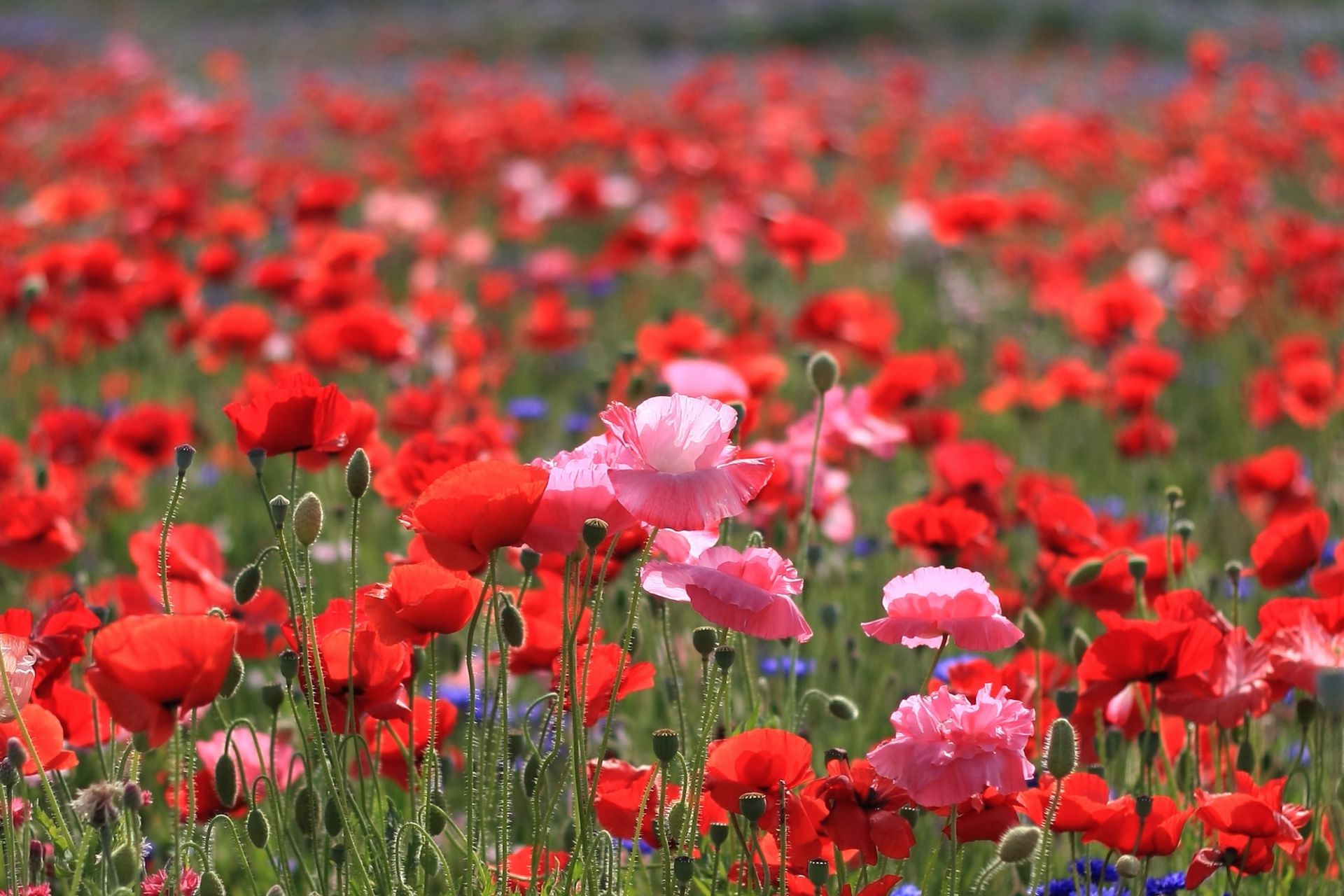 Coquelicots roses et têtes de coquelicots sur fond flou