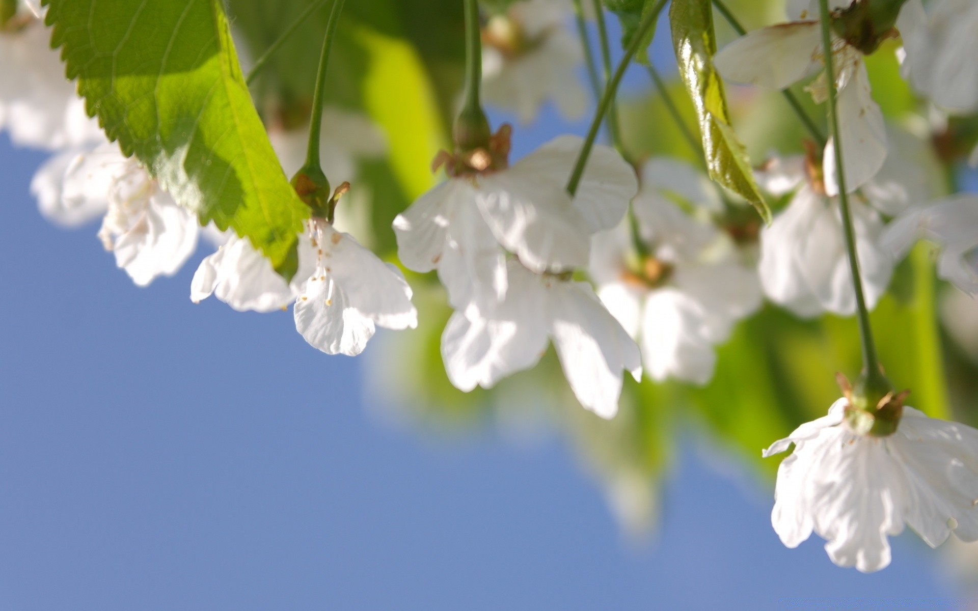 Fleurs de cerisiers en fleurs parmi le feuillage sur fond de ciel bleuFleurs de cerisiers en fleurs parmi le feuillage sur fond de ciel bleu