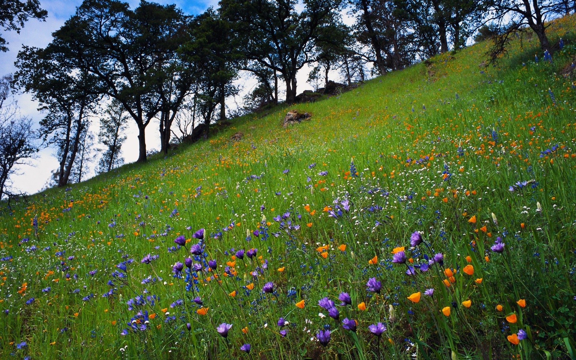 Ruisseau sinueux avec des pierres blanches le long des rives, courant au milieu d'une prairie parsemée de fleursRuisseau sinueux avec des pierres blanches le long des rives, courant au milieu d'une Prairie parsemée de fleurs