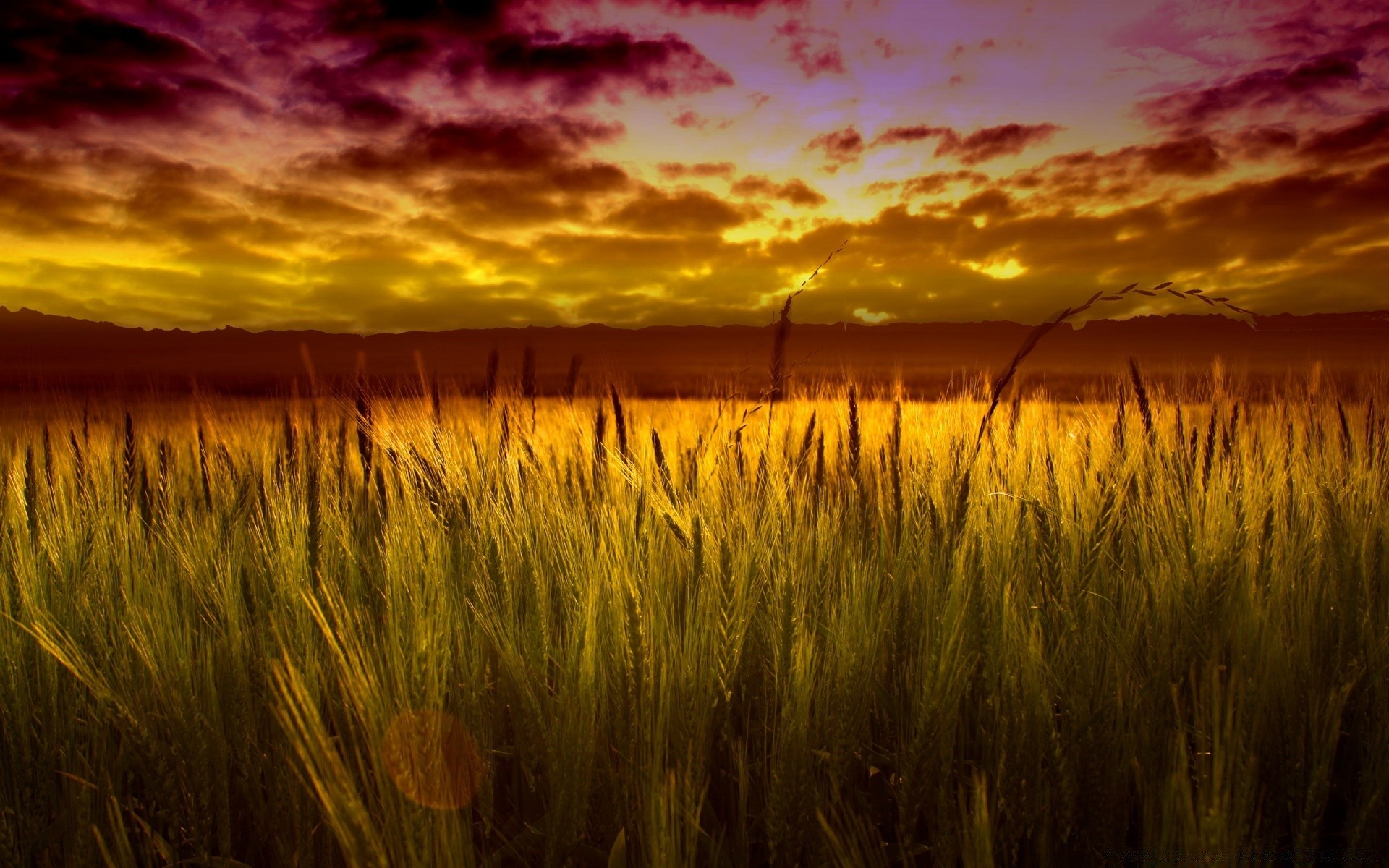 Germination du blé au coucher du soleil pourpre