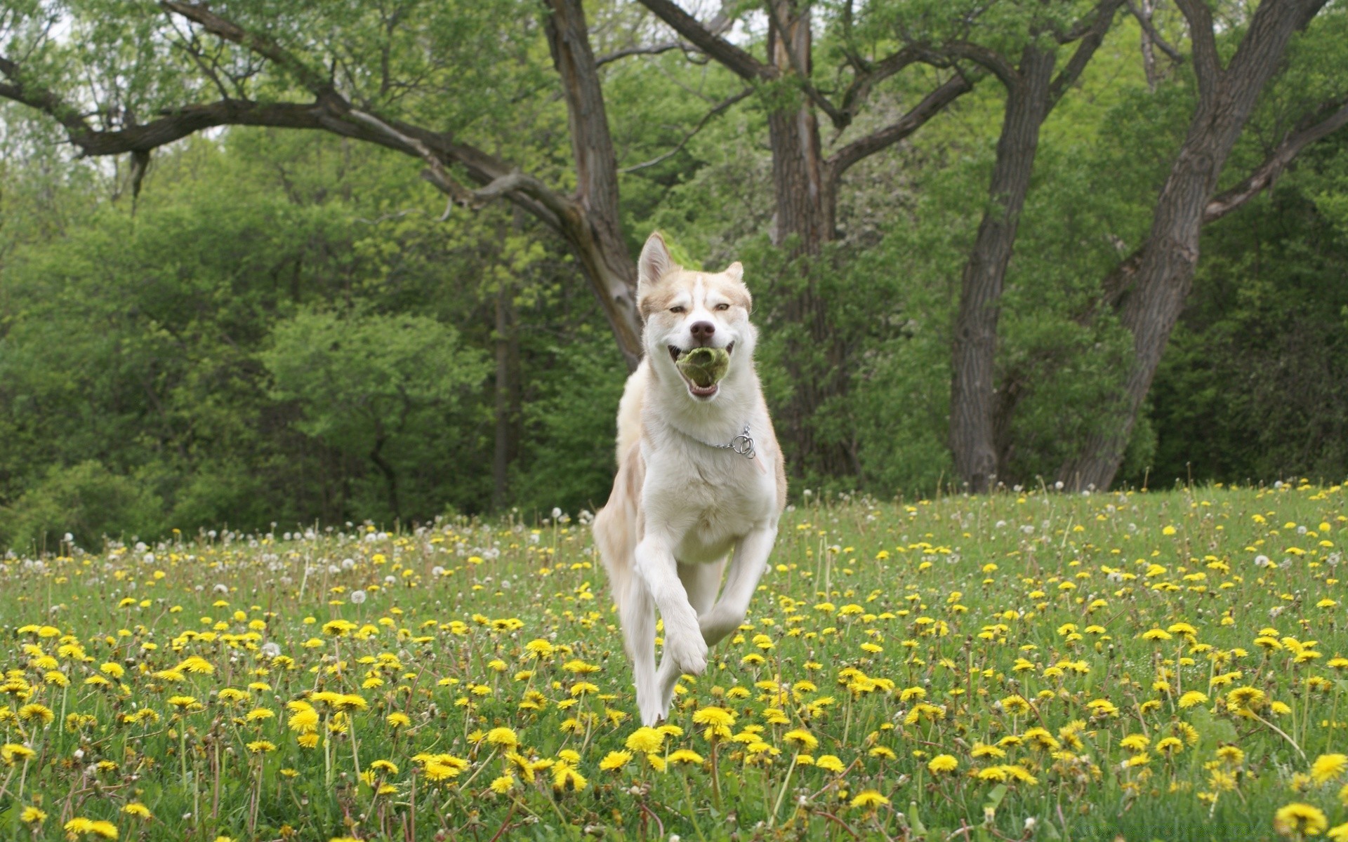 Chien joyeux court sur le champ avec des pissenlits