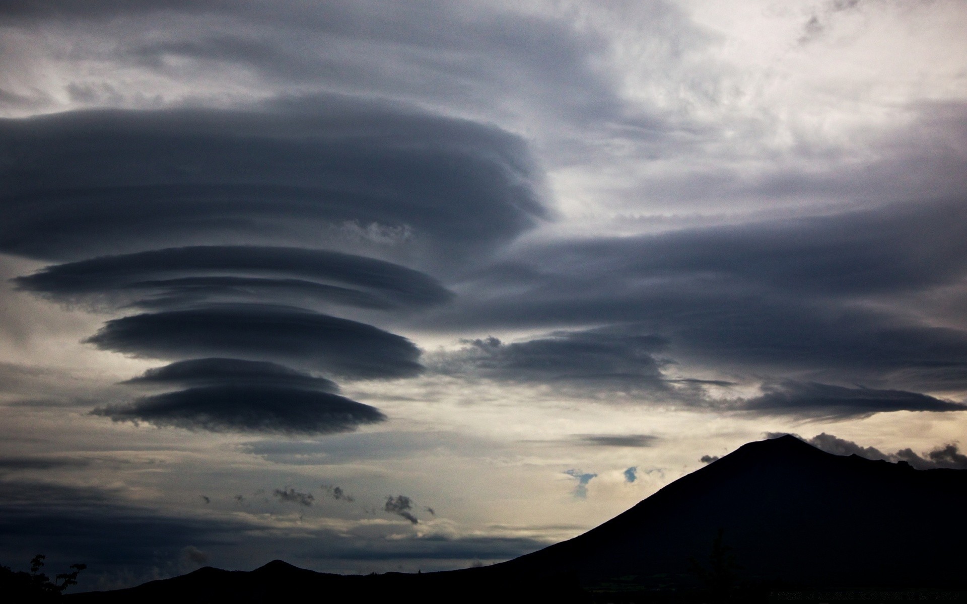 Beau coucher de soleil sur fond de montagnes et de l'eau