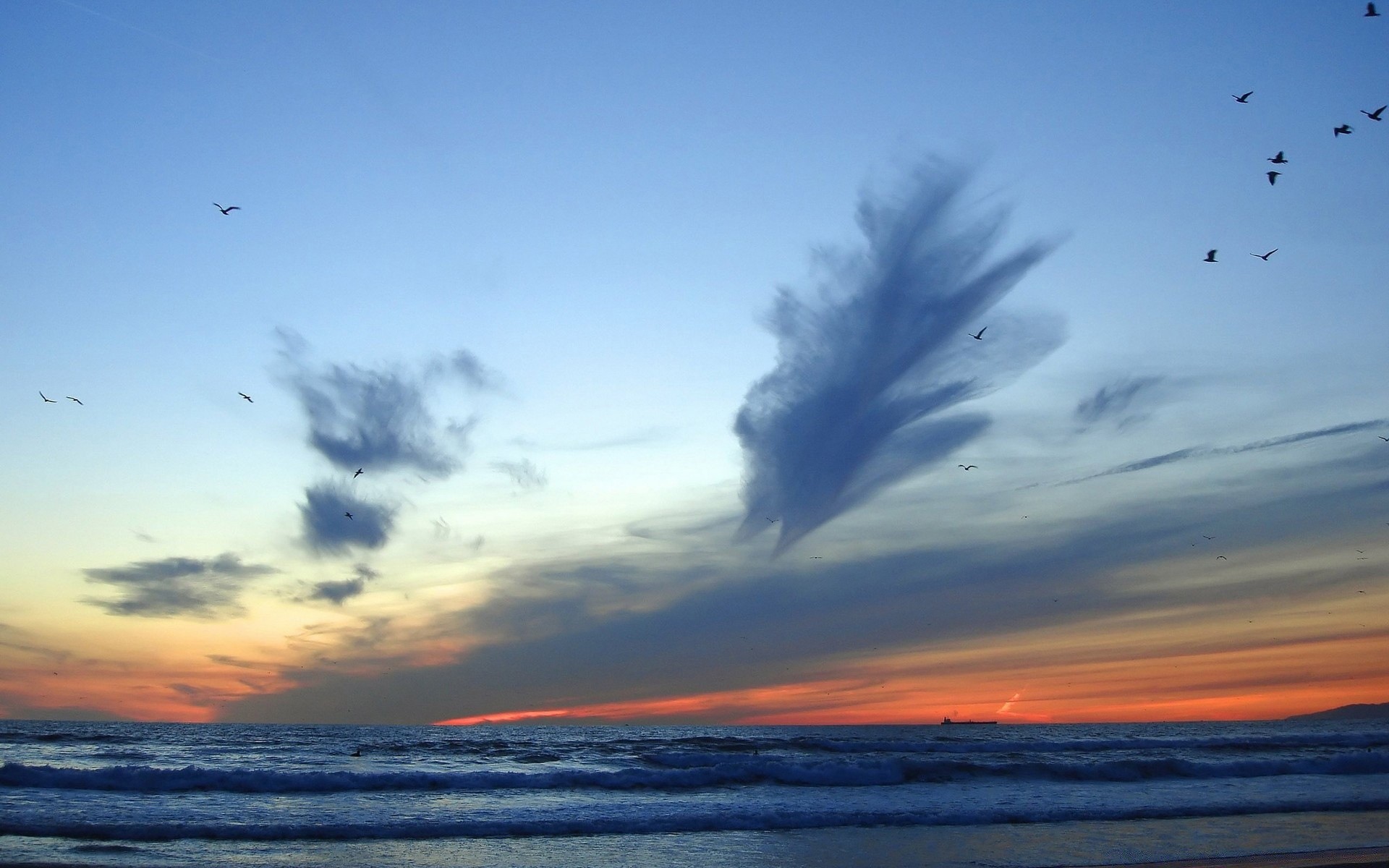 Plage de vacances avec des arbres tropicaux sur fond de coucher de soleil