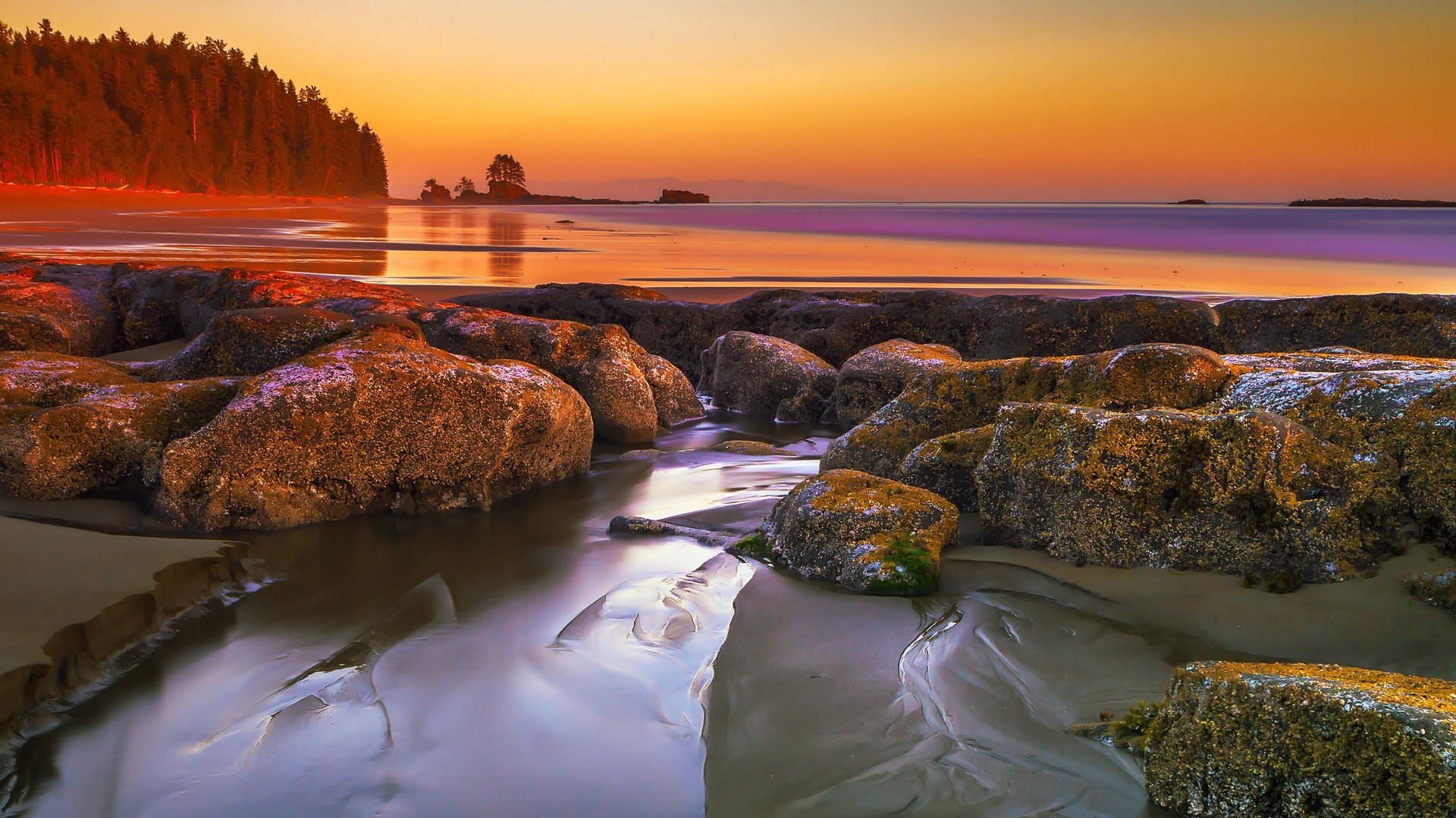 L'eau qui coule à travers les pierres, sur fond de coucher de soleil