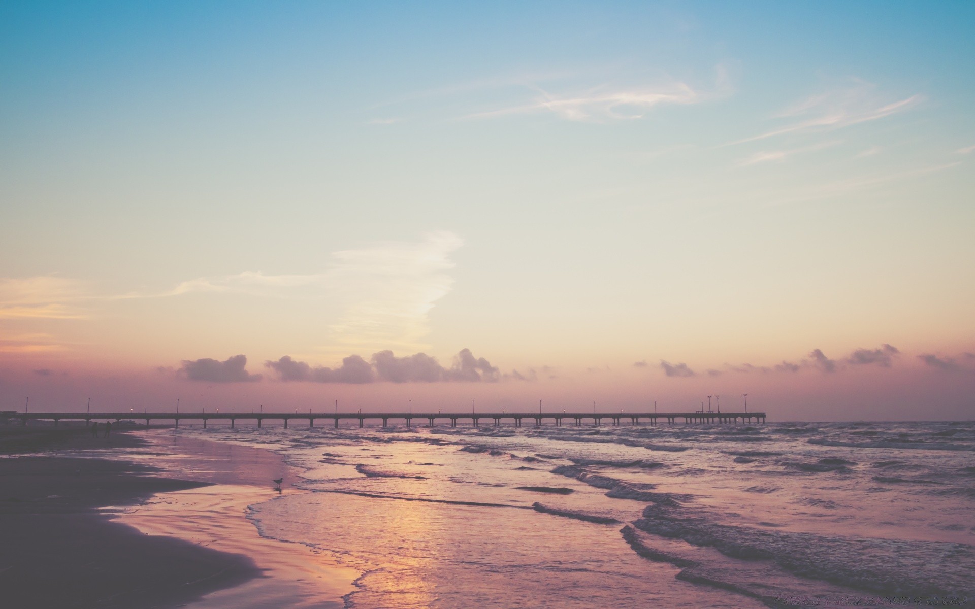 Pont au loin et les vagues sur fond de ciel bleu rose