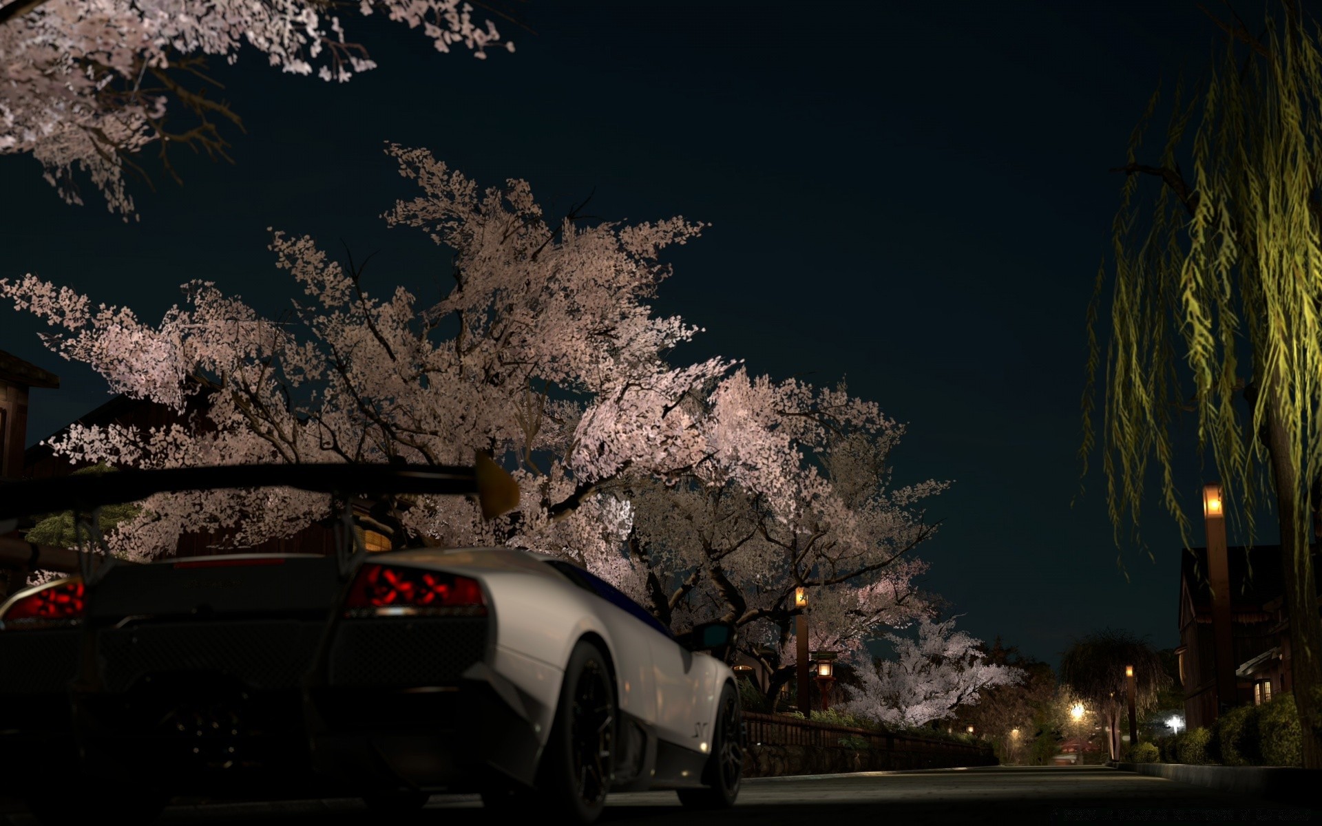 Voiture grise dans la rue du soir éclairée par des lanternes