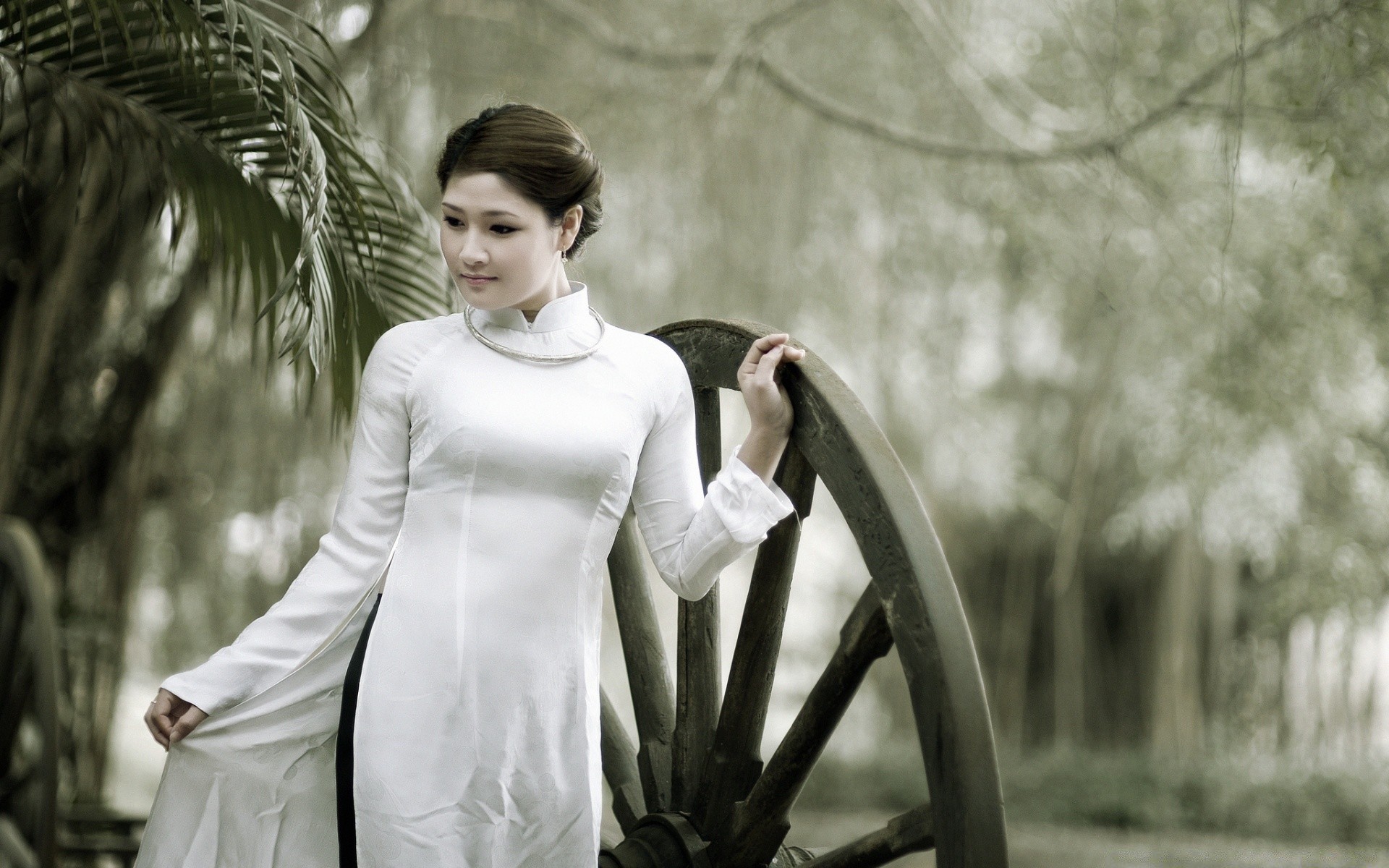 Fille asiatique dans une robe blanche fermée repose sa main sur une grande roue en boisFille asiatique dans une robe blanche fermée repose sa main sur une grande roue en bois
