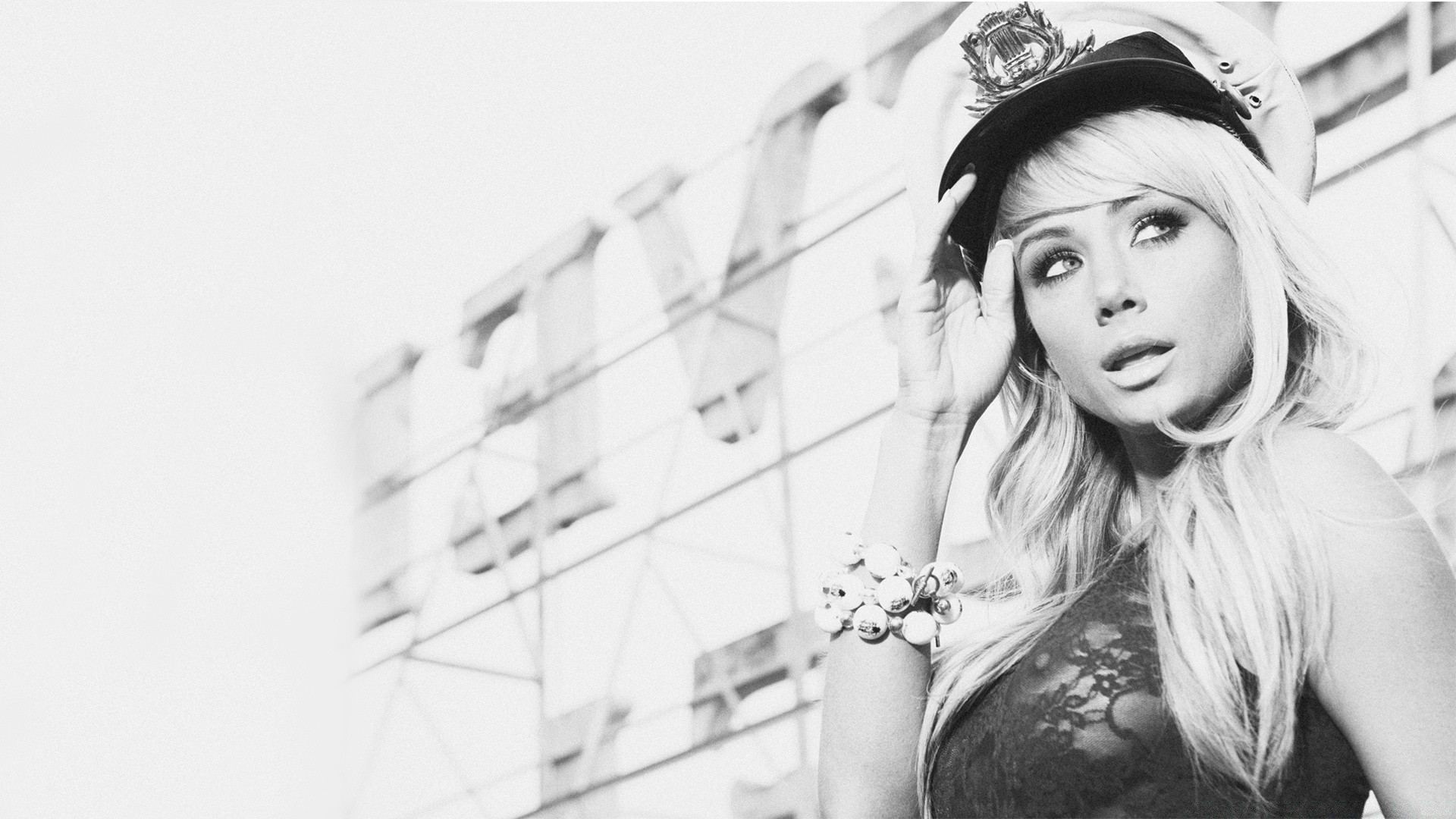 Fille asiatique dans une robe blanche fermée repose sa main sur une grande roue en bois