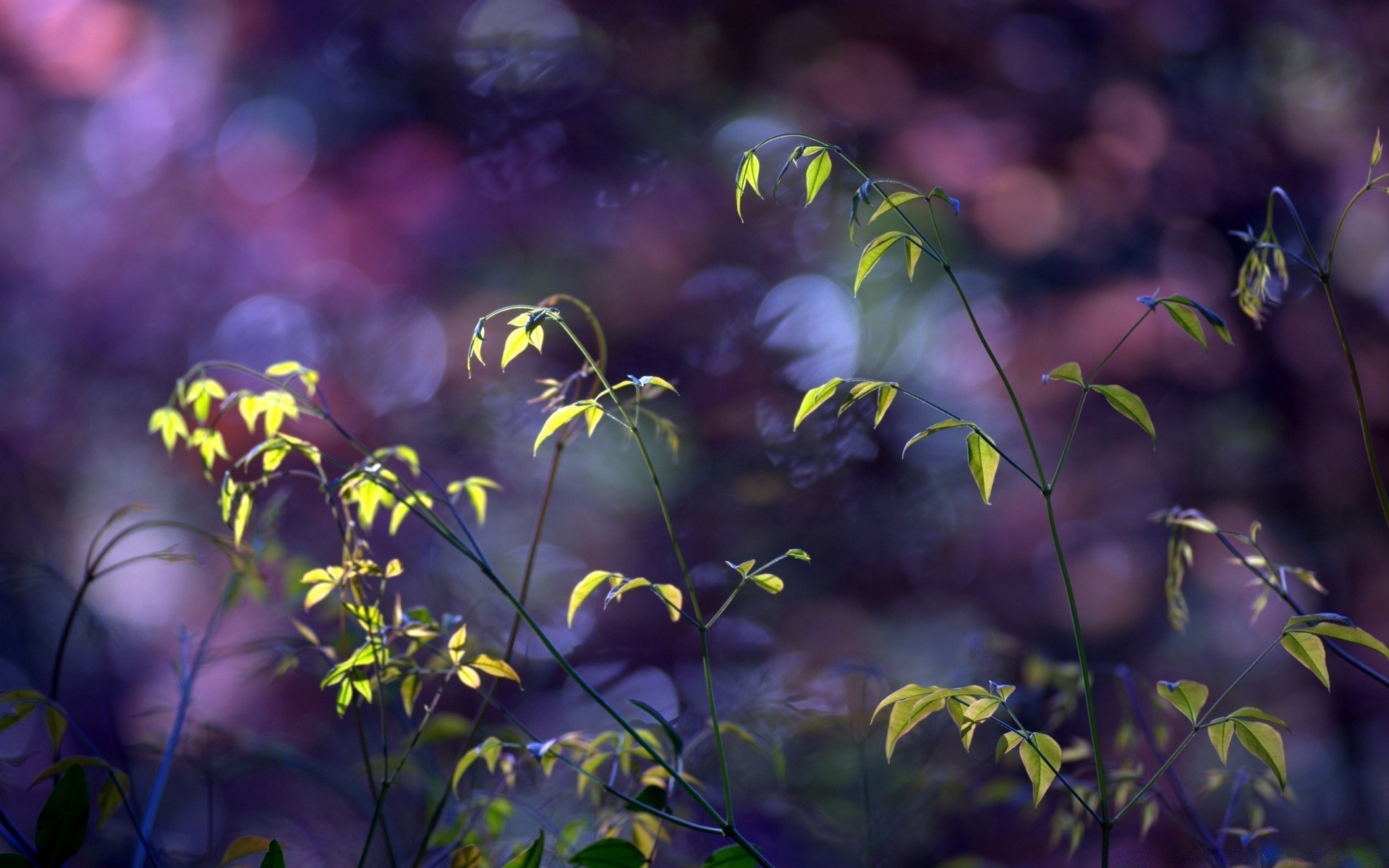 Fines branches d'arbustes de verdure sur un fond flou de couleur pourpre